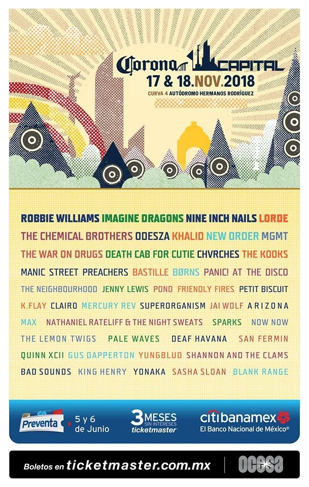 Este lunes, el Festival Corona Capital nos sorprendió a todos con el destape de su cartel vía video. Tras tanta expectativa, los artistas y bandas que llegarán este próximo 17 y 18 de noviembre al Autódromo Hermanos Rodríguez en la Ciudad de México son: Lorde, Robbie Williams, The Chemical Brothers, Nine Inch Nails, MGMT e Imagine Dragons.Además de Odesza, Khalid, New Order, The War on Drugs, Death Cab For Cutie, Chvrches, The Kooks, Manic Street Preachers, Bastille, Borns, Panic! At the Disco, The Neighbourhood, Jenny Lewis, Pond, Friendly Fires, Petit Biscuit, K. Flay, Clairo, Mercury Rev, Superorganism, Jai Wolf, Arizona, Max, Nathaniel Rateliff & The Night Sweats, Sparks, Now Now, The Lemon Twigs, Pale Waves, Deaf Havana, San Fermin, Quinn XCII, Gus Dapperton, Yungblud, Shannon and The Clams, Bad Sounds, King Henry, Yonaka, Sasha Sloan y Blank Range. La preventa Citibanamex será el 5 y 6 de junio y el abono en primera fase será de $2,899.La venta general da inicio el día 7 de junio.