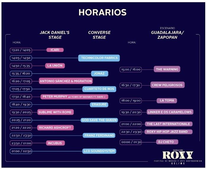 Los promotores del Festival Roxy 2018 dieron a conocer los horarios de las bandas que se presentarán en su segunda edición.Los escenarios Jack Daniel's Stage, Converse Stage y Guadalajara / Zapopan, recibirán a las 21 bandas que conforman el cartel.El grupo tapatío Ícari, conformado por Icari Gómez Aldana y Gustavo Gascón abriran el festival en punto de las 13:20 en el escenario Jack Daniel's y compartirán escenario con La Unión, Antonio Sánchez & Migration, Peter Murphy, Sublime with Rome, Richard Ashcroft e Incubus.El grupo neoyorquino de música dance-punk LCD Soundsystem será el encargado de cerrar el Roxy. La banda liderada por James Murphy saldrán al escenario a la 01:00 en el Converse Stage.Los tickets se pueden adquirir en ticketmaster.com a un precio de mil 700 en zona VIP y mil 100 más cargos en zona general.El Roxy Fest 2018 se llevará a cabo el 21 de abril en Terraza Vallarta (Calzada Nueva #47).JB.