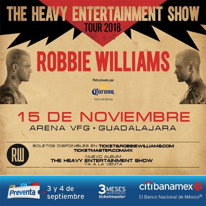 Aún no terminan las sorpresas y shows internacionales para Guadalajara en el 2018 ya que este 15 de noviembre Robert Peter Williams, mejor conocido como Robbie Williams, dará un concierto en la Arena VFG.La preventa Citibanamex tendrá lugar el 3 y 4 de septiembre mientras que la venta general el 5 en Ticketmaster México. y por teléfono al 3818-3800, así como en la taquilla del recinto.BoletosPista A (entrada general parados): $2,580 Pista B (entrada general parados): $2,180 Grada: $1,780 Grada: $1,380 Grada: $1,080 Grada: $580 *Los precios aquí mostrados NO INCLUYEN cargos por servicio de Ticketmaster*Anteriormente se había anunciado que el ícono británico estará actuando como cabeza de cartel del Festival Corona Capital de la Ciudad de México.Como solista, Robbie ha vendido más de 75 millones de álbumes y tiene seis de los 100 álbumes más vendidos en la historia británica.