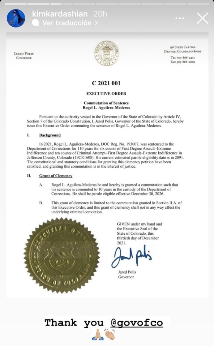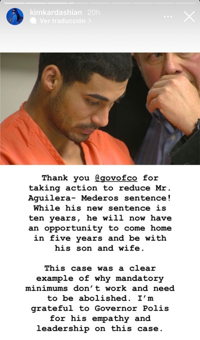 Hace unos días el nombre de Rogel Aguilera Maderos, un camionero cubano, se daba a conocer en todo el mundo junto a la noticia de su sentencia: 110 años de cárcel en una prisión de colorado por haber conducido un camión de carga que perdió los frenos; ocasionando con ello un fatal accidente en el que cuatro personas perdieron la vida y otras tantas resultaron heridas.Desde entonces, la enorme la condena del joven hispano que en aquel entonces tenía apenas 23 años generó inconformidad en miles de personas en Estados Unidos y el mundo, incluyendo algunas celebridades como Kim Kardashian y Shakira, quienes levantaron la voz en días interiores pidiendo al gobernador de Colorado, Jared Polis, clemencia para Rogel.Por su parte, Polis ha dado a conocer este jueves que concederían al acusado una reducción de 100 años en su condena, dejando además sus 10 años restantes como viables a la libertad condicional en un plazo de 5 años. Una medida sorpresiva que ha sido bien recibida por Rogel y muy aplaudida por Kim y Shakira, quienes no tardaron en reaccionar con emoción a la noticia en redes sociales."Me alienta saber que, cuando las personas se unen, la justicia aún puede perseguirse y todos podemos lograr un cambio. Espero que podamos seguir alzando la voz donde quiera que haya injusticia en la palabra, porque hay mucho y somos muchos". Escribío al respecto Shakira en Instagram.Kim Kardashian compartió un par de stories a instagram en las que agradeció el actuar del gobernador de Colorado. "Gracias @govofco por haber tomando medidas para reducir la ¡Sentencia de Mederos! Mientras que su nueva sentencia es de diez años, ahora tendrá una oportunidad de volver a casa en cinco años y estar con su hijo y su esposa. Este caso fue un claro ejemplo de por qué los mínimos obligatorios no funcionan y necesitan ser abolidos. estoy agradecida al gobernador Polis por su empatía y liderazgo en este caso". “Creo que mereces clemencia por varias razones. Fuiste condenado a 110 años en prisión, en realidad más que una cadena perpetua, por un acto fatal, aunque no intencionado”, se lee en un del gobernador dirigido a Aguilera Maderos, en el que se le notifica la reducción de su condena.