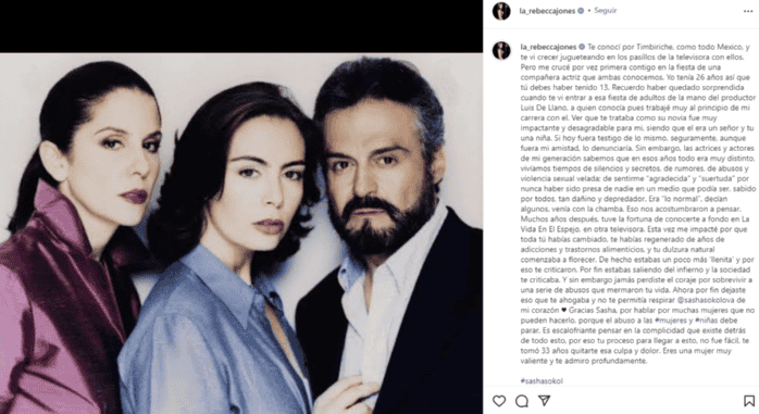 A unas semanas de la denuncia pública que realizó Sasha Sokol en contra del actor Luis De Llano donde menciona haber sido víctima de abuso por parte del productor. La actriz Rebecca Jones rompe el silencio y externa su apoyo a Sokol.A través de redes sociales la también actriz Rebecca Jones, relató sobre la época en que Sasha era pareja de De Llano."Recuerdo haber quedado sorprendida cuando te vi entrar a esa fiesta de adultos de la mano del productor Luis De Llano, a quien conocía, pues trabajé muy al principio de mi carrera con él. Ver que te trataba como su novia fue muy impactante y desagradable para mí, siendo que él era un señor y tú una niña", reiteró.En el marco del Día Internacional de la Mujer, el pasado 8 de marzo, la actriz y cantante Sasha Sokol habló por primera vez abiertamente sobre cómo vivió el abuso, pues tuvo una relación con De Llano que empezó cuando ella era menor de edad (tenía 14 años y Luis 39).Sus palabras surgieron en respuesta a una entrevista en la que el productor habló con Yordi Rosado, normalizando lo que había pasado y señalando que sólo habían salido poco tiempo, aunque, de acuerdo con Sokol, fueron cuatro años.Personalidades como el propio Benny Ibarra (sobrino de Luis de Llano) externaron en su momento su apoyo a Sasha y ahora es Rebecca quien ha hecho lo propio, criticando cómo se movía el medio del espectáculo ocultando este tipo de hechos."Si hoy fuera testigo de lo mismo, seguramente, aunque fuera mi amistad, lo denunciaría. Sin embargo, las actrices y actores de mi generación sabemos que en esos años todo era muy distinto, vivíamos tiempos de silencios y secretos, de rumores, de abusos y violencia sexual velada; de sentirme 'agradecida' y 'suertuda' por nunca haber sido presa de nadie en un medio que podía ser, sabido por todos, tan dañino y depredador", señaló Rebecca.Jones recordó que cuando volvió a coincidir con Sasha, como parte del elenco de la telenovela "La vida en el espejo", ya se encontró con una persona diferente, pues la cantante había pasado por problemas de adicciones."Esta vez me impacté porque toda tú habías cambiado, te habías regenerado de años de adicciones y trastornos alimenticios y tu dulzura natural comenzaba a florecer. De hecho, estabas un poco más 'llenita' y por eso te criticaron. Por fin estabas saliendo del infierno y la sociedad te criticaba. Y sin embargo, jamás perdiste el coraje por sobrevivir a una serie de abusos que mermaron tu vida", señaló Jones.Finamente Jones le agradece a la integrante de Timbiriche por alzar la voz para que el abuso a las mujeres y niñas pare."Es escalofriante pensar en la complicidad que existe detrás de todo esto, por eso tu proceso para llegar a esto, no fue fácil, te tomó 33 años quitarte esa culpa y dolor. Eres una mujer muy valiente y te admiro profundamente".AF