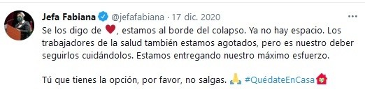 A través de sus “historias” de Instagram, el cantante colombiano Sebastián Yatra agradeció la labor que el personal médico ha realizado para combatir la pandemia por COVID-19 al estar en la primera línea de batalla.Utilizando el #WomenHistoryMonth y #ChicasIdeales, Yatra etiquetó en su publicación a Fabiana Maribel Zepeda Arias, jefa de la División de Programas de Enfermería del Instituto Mexicano del Seguro Social (IMSS),quien recientemente fue reconocida, junto a otras enfermeras y representantes del sector médico, por parte del Senado de la República.“Hay millones y millones de mujeres que trabajan día y noche para podernos sacar de esta pandemia global lo más rápido posible. Les quiero compartir a una de ellas, que es la ‘chica ideal’ del día, se llama jefa Fabiana, y es la jefa de enfermeras del Instituto Mexicano del Seguro Social y también es parte del comité que pone los parámetros y todas las cosas gubernamentales en México para poder sacar adelante el tema de la vacuna todo lo más rápido posible. Le agradezco a ella y a millones de enfermeras alrededor del mundo”.A través de sus redes sociales, la jefa Fabiana Zepeda (@jefafabiana) ha recalcado la importancia de seguir las recomendaciones y protocolos sanitarios para frenar los contagios de coronavirus, además de solicitar la empatía de los ciudadanos en tuits que se viralizaron cuando los contagios y hospitalizaciones iban en aumento.“Se los digo de (corazón), estamos al borde del colapso. Ya no hay espacio. Los trabajadores de la salud también estamos agotados, pero es nuestro deber seguirlos cuidándolos. Estamos entregando nuestro máximo esfuerzo. Tú que tienes la opción, por favor, no salgas. #QuédateEnCasa”, comentó entonces el 17 de diciembre de 2020, siendo uno de sus tuits más replicados nacionalmente.En el reciente reconocimiento que el Senado hizo a los cuerpos de enfermería, Fabiana Zepeda memoró a sus colegas acaecidos en la función de su labor a causa de la pandemia y externó: “Aquellas mujeres, mis queridas colegas que partieron a otro mundo, que perdieron la vida en la lucha contra la pandemia. Dejaron una huella imborrable en la historia del IMSS, pero también en la historia de México al ser ejemplo de lucha, fuerza, demostrar la grandeza de nuestro gremio, y segura estoy que sus familias, al igual que todos nosotros, se encuentran orgullosas de ellas”. jb