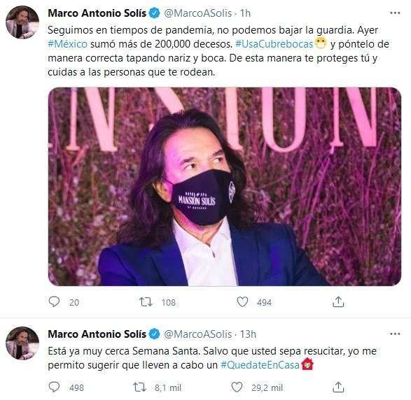 Marco Antonio Solís, "El Buki", pidió a sus seguidores en redes sociales quedarse en casa en estas vacaciones de Semana Santa para no tener el riesgo de contraer el coronavirus COVID-19, "salvo que usted sepa resucitar"."El Buki", quien es objeto de memes en redes sociales por su parecido a la iconografía de Jesucristo, escribió un tweet en el que mencionó: "Está ya muy cerca Semana Santa. Salvo que usted sepa resucitar, yo me permito sugerir que lleven a cabo un #QuedateEnCasa", por lo que rápidamente usuarios comenzaron a referenciarlo como un mandato divino.Tiempo después, Marco Antonio Solís compartió una nueva publicación en la que señaló que no se puede bajar la guardia porque seguimos en tiempo de pandemia. Recordó que México sumó 200 muertes por el COVID-19 y pidió a todos usar, de manera correcta, el uso de cubrebocas.Inmediatamente sus dos publicaciones fueron compartidas por usuarios de redes sociales y, algunos, hicieron bromas que fueron desde un: "Lo que usted diga mi señor Jesucristo", "Él sabe de lo que habla: resucitó al tercer día", hasta un "Por favor el próximo jueves no vaya a ninguna cena! Hay alguien que lo quiere traicionar".México reportó ayer jueves 584 nuevas muertes por COVID-19 en las últimas 24 horas y suma 200 mil 211 decesos desde el inicio de la pandemia, según datos de la Secretaría de Salud.Además, el país reportó cinco mil 787 nuevos casos del coronavirus SARS-CoV-2 para un total de dos millones 214 mil 542 contagios.OA