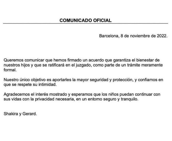 Shakira y Gerard Piqué emitieron un comunicado donde confirman el pacto alcanzado entre ambas partes por la custodia de sus hijos, después de las negociaciones mantenidas en los últimos meses en lo relativo al cuidado y crianza de los pequeños."Queremos comunicar que hemos firmado un acuerdo que garantiza el bienestar de nuestros hijos y que se ratificará en el juzgado, como parte de un trámite meramente formal. Nuestro único objetivo es aportarles la mayor seguridad y protección, y confiamos en que se respete su intimidad. Agradecemos el interés mostrado y esperamos que los niños puedan continuar con sus vidas con la privacidad necesaria, en un entorno tranquilo. Shakira y Gerard".No se especifican los términos del arreglo, pero lo que es cien por ciento seguro es que la artista se mudará con Milan y Sasha a Miami a partir de 2023. FS