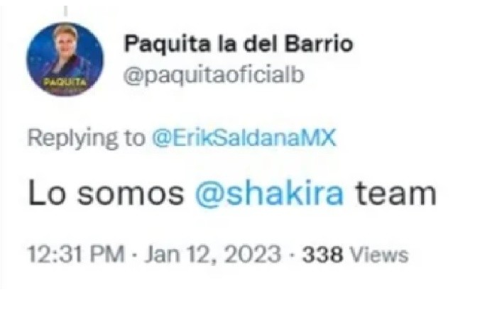 Luego de la canción de Shakira en colaboración con el productor argentino, Bizarrap, usuarios en redes sociales dieron sus diferentes puntos de vista a tal grado de comparar a la cantante colombiana con otras artistas que también dedicaron canciones de desamor a sus parejas, una de ellas la famosa mexicana Paquita la del Barrio. Inmediatamente la comparación entre ambas artistas se volvió viral, incluso hubo quienes compartieron un meme en el cual mostraba que Shakira se iba convirtiendo en Paquita la del Barrio, esto luego del tema lanzado contra su expareja Gerard Piqué. Y es que en los casi tres minutos y medio del nuevo tema "Music Sessions #53", la barranquillera hace referencia a su Piqué, asimismo, mencionó a Clara Chía, quien fue la amante de su expareja cuando aún estaban casados.En consecuencia, los internautas la relacionaron con la cantante mexicana, Paquita la del Barrio que se caracteriza por tener letras de "odio y desprecio" hacia una expareja o hacia los hombres.Varias celebridades han mostrado su apoyo a Shakira mediante redes sociales, como: Fonseca, el rapero Chuty, Alejandro Sanz, entre otros.No obstante, el periodista Erik Saldaña le preguntó a Paquita mediante una publicación de Twitter si se consideraba team Shakira, a lo que ella respondió que sí.Eso no fue todo, ya que a través de su cuenta oficial de Instagram Paquita publicó una foto con el mensaje: “Un abrazo para @shakira”.Otra persona que sorprendentemente apoyó a la también empresaria, fue su supuesta rival Antonela Roccuzzo quien es la esposa del jugador argentino Lionel Messi.MF