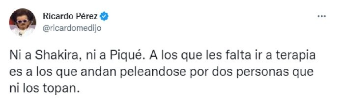 El nuevo tema de Shakira en colaboración con Bizarrap ha generado un gran debate en redes sociales, a tal grado de que millones de usuarios defiendan ya sea a la colombiana o Piqué, esto por la letra de la canción que habla acerca de su ruptura en junio del año pasado. A eso varias celebridades se han unido con su opinión, entre ellas el comediante del famoso podcast "La Cotorrisa", Ricardo Pérez, quien decidió mandar un mensaje a todas las personas que defienden ya sea a Shakira o Piqué por dicho tema. Fue a través de su cuenta de Twitter donde el comediante que participó en el concurso de "LOL: Last One Laughing" se lanzó contra los usuarios que se encuentran peleando por los dos famosos, pues mencionó que los que deberían "ir a terapia" eran ellos y no la pareja. "Ni a Shakira, ni a Piqué. A los que les falta ir a terapia es a los que andan peleándose por dos personas que ni los topan", se lee en el tuit. Ante la opinión, la publicación comenzó a generar miles de reacciones, la mayoría apoyando al comentario del comediante mexicano. Hasta el momento el tuit cuenta con más de 20 mil me gusta y alrededor de dos mil 500 retweets. MF