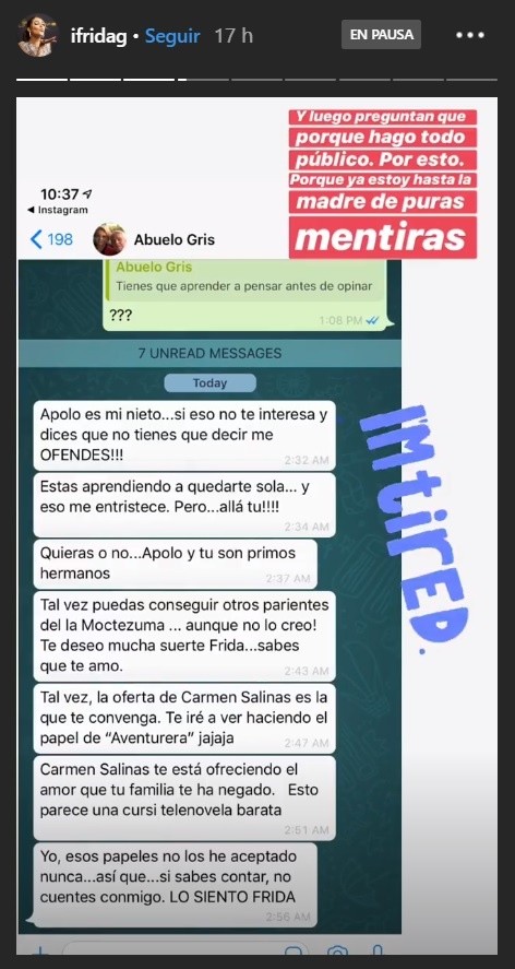 Luego de que Enrique Guzmán hablara sobre el distanciamiento entre Frida Sofía y la familia Pinal, la joven publicó en su cuenta de Instagram una conversación con su abuelo vía WhatsApp, en ella se lee cómo Guzmán le retira su apoyo.