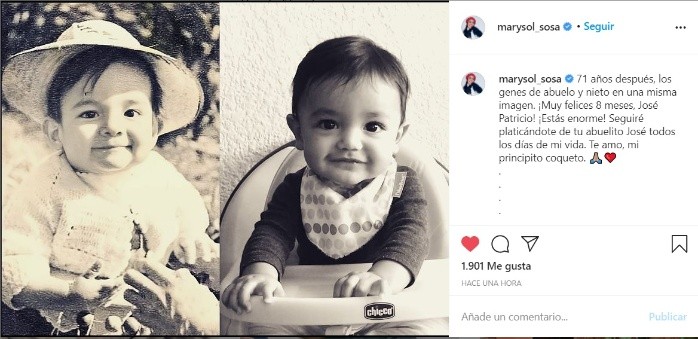 Marysol Sosa festeja los ocho meses del nacimiento de su pequeño príncipe, su hijo José Patricio, quien al parecer va a tener un gran parecido a su abuelo, el cantante José José.Al menos, el parecido entre ambos cuando tenían la misma edad, 8 meses, es impresionante, así lo demostró Marysol con una fotografía en la que compara a su padre y su hijo."71 años después, los genes de abuelo y nieto en una misma imagen. ¡Muy felices 8 meses, José? Patricio! ¡Estás enorme! Seguiré platicándote de tu abuelito José todos los días de mi vida. Te amo, mi principito coqueto", se lee en el mensaje que acompaña la instantánea en blanco y negro.Sobre el poder de los genes, Marysol Sosa también ha mostrado el parecido entre su esposo y su hija Elena cuando ambos tenían dos años."Este es mi esposo @xaxaorozco en 1979 justo a la edad de Elena (2 años 2 meses). No cabe duda que los genes se manifiestan. Qué bonito recuerdo. Qué rápida se va la vida. Y qué hermoso tenerte en mi vida y que podamos compartir el ser padres".La familia Orozco Sosa inició el 2021 con salud y buenos deseos para sus seguidores, así lo mostraron en Instagram, donde además no pierden oportunidad de externar el amor hacia "El príncipe de la canción"."Gracias Señor Jesús por mi familia, por la salud, por la bendición de seguir aquí?. A todos ustedes, hermosa gente, hasta el último rincón del mundo, la Familia Orozco Sosa les deseamos un Feliz Año Nuevo 2021. ¡Todo estará mejor y nos volveremos a abrazar! Cuídense mucho. Bendiciones siempre".AC