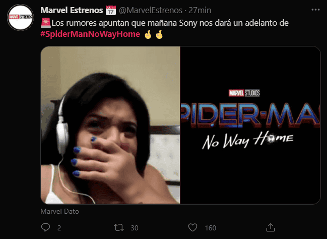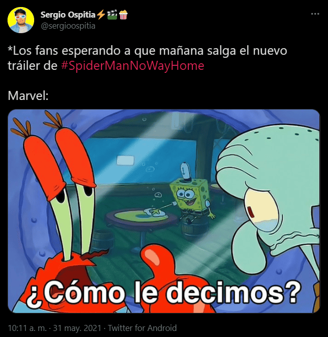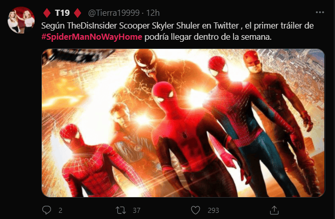 Los fans de Marvel no quieren esperar para saber de una vez por todas qué es lo que veremos en la tercera película protagonizada por Tom Holland “Spider-Man: No Way Home”, y es que muestran su entusiasmo sobre los rumores de que en esta semana se revelaría el tráiler de la película.Fue a través de Twitter que “Spider-Man: No Way Home” se volvió tendencia con miles de comentarios sobre las posibles tramas que podría tener la película de Marvel y Sony.De acuerdo a una publicación de un miembro del sitio TheDisInsider, el tráiler de la tercera entrega de “Spider-Man” llegaría esta semana, sin embargo, esta información no ha sido confirmada por Marvel. No obstante, Holland cumple años el 1 de junio, por lo que sería una fecha perfecta para estrenar el avance.Lo anterior provocó que los fans compartieran lo que esperan ver en el avance y el posible destino del personaje interpretado por Holland, así como el “Spider-verse”.“Spider-Man: No Way Home” llegará a los cines el 17 de diciembre de este año y traerá de regreso a Zendaya, Tom Holland, Alfred Molina y Jamie Foxx.Antes de la llegada del hombre arácnido al cine, los fanáticos de Marvel podrán ver la película de “Black Widow”, “Eternals”, “Shang-Chi y la leyenda de los diez anillos” y la serie “Loki”.AC