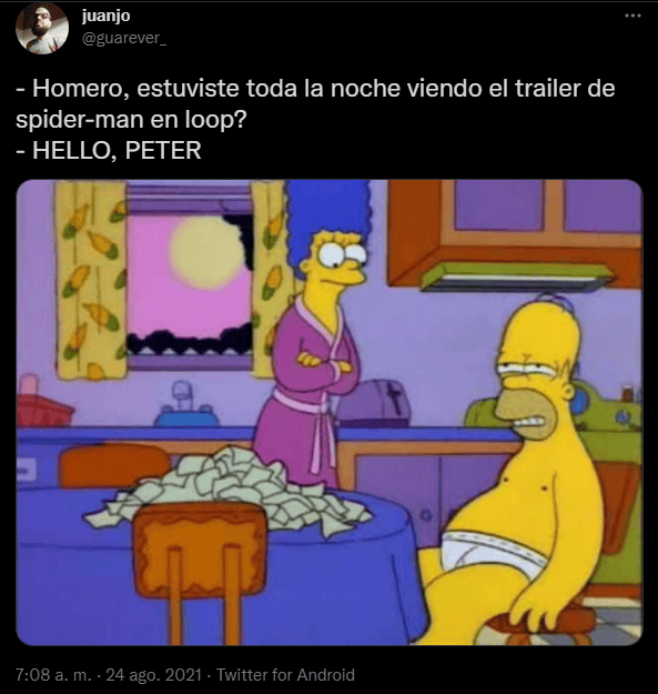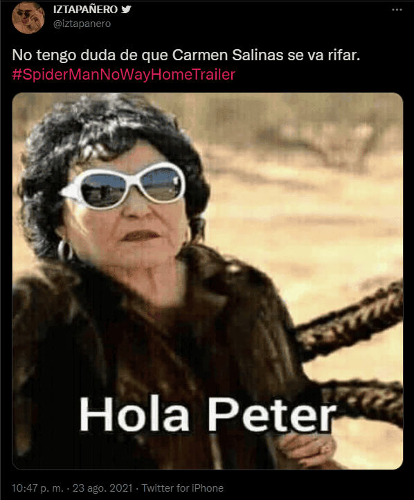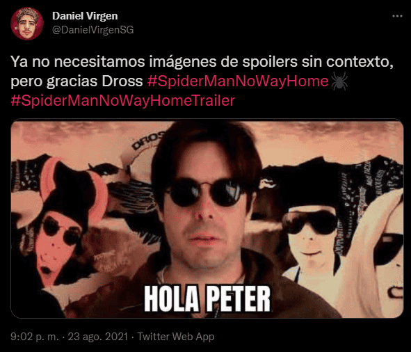 La noche de este lunes se estrenó oficialmente el teaser tráiler de “Spider-Man: No Way Home”, luego de un par de días de revuelo por las filtraciones, incluídas el avance.Pero eso no fue todo lo que reventó Internet pues, a pesar de que muchos fans ya habían visto el tráiler filtrado con mala calidad, se sorprendieron al ver de regreso a villanos como “Doctor Octopus” (Alfred Molina) y “Duende Verde” (Willem Dafoe), lo que provocó memes y miles de reacciones."Spider-Man: No Way Home" se estrenará en cines el próximo 17 de diciembre.“Días, porque bueno el tráiler de Spiderman”, escribió la usuario @R0_Giselle en Twitter. Alguien más agregó con un meme que pasó toda la noche viendo el adelanto de “Spider-Man”.Incluso personalidades como Dross, Carmen Salinas y AMLO fueron comparados con “Octopus” por la escena del tráiler donde posa con sus clásicas gafas oscuras.***Si te interesó esta noticia y quieres saber más, entonces descarga y descubre INFORMAPlus, la aplicación digital de EL INFORMADOR, en donde tenemos contenidos exclusivos, seleccionados por nuestros editores, para darles una experiencia más completa a los lectores.Descarga la aplicación y pruébala GRATIS por treinta días.Para iOS: https://apple.co/35jaVgbPara Android: https://bit.ly/3gwVSEVSi eres suscriptor de EL INFORMADOR tu acceso está incluido, solicítalo al 33 3678-7777AC