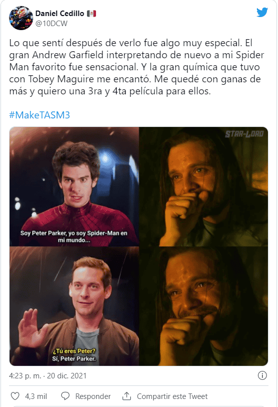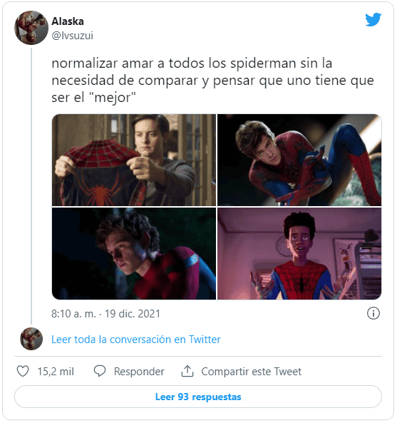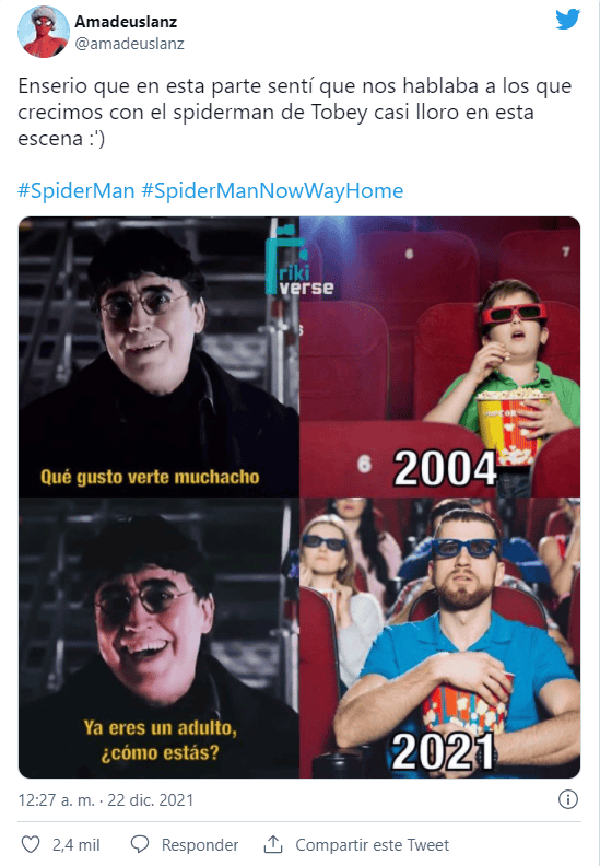La cantidad de posturas que podemos tomar respecto a “Spiderman: No Way Home” son muy diversas, están los “haters” que critican la cinta por sus huecos argumentales, también los que prefieren el universo DC o los expertos que nos hablan de cómo en la película convierte a Peter Parker en un adulto, y a un Spiderman en un héroe más independiente, listo todo para los reto futuros.Por otro lado tenemos a los más nostálgicos, que lloraron, gritaron y sacudieron sus asientos y el asiento de al lado con cada escena de la película. A éstos últimos nos vamos a dirigir hoy.Cuando tenía once años, mi mamá me llevó a un lugar oscuro y con olor a palomitas llamado Cine a ver “Spiderman” ("El hombre araña", 2002). Ver en una enorme pantalla al superhéroe arácnido columpiándose por la ciudad, y de rascacielos en rascacielos fue increíblemente mágico. La primera trilogía se hizo de un valor muy importante por ser la primera experiencia de ese nivel en el cine. Ahora imagina que dos décadas después de ver a Tobey Maguire usando el icónico traje por primera vez, lo puedes volver a ver con el traje puesto para ayudar a salvar una vez más la ciudad,En los últimos meses las expectativas por “Spiderman: No Way Home” aumentaron exponencialmente, y ¿cómo no? con un multiverso semi confirmado con la aparición de Alfred Mollina como el Dr. Octopus en el trailer y la confirmación oficial del queridísimo actor Willen Dafoe como el Duende Verde, las posibilidades de ver al hombre de arena de Thomas Richard McMillen, el electro (Jamie Foxx) y lagarto (Rhys Ifans) que pelearon contra el spidey de Andrew Garfield.Sin embargo, el deseo de varias generaciones que vieron en la serie animada y en los cómics es Spider Verse, todavía estaba en duda, ¿podríamos ver a los tres Spiderman peleando juntos? Pues sí, ver a tres generaciones de Spiderman fue posible.El film arranca exactamente en donde terminó la escena postcréditos de “Far From Home”, cuando Mysterio hace público que Peter Parker es “el amigable vecino hombre araña”. La vida de Peter, similar a los cómics, se ve gravemente afectada una vez que su identidad es descubierta, y al igual que en los cómics Peter decide buscar a Dr. Strange (Benedict Cumberbatch) para que lo ayude con un hechizo que haga que todos olviden su identidad, excepto quienes ya la conocían desde antes, a diferencia de los cómics, Strange acepta.Para variar todo sale mal y ahora los villanos de otros universos que ya sabían la identidad de Peter Parker están en el del personaje de Holland, quien en lugar de pelear contra ellos decide que puede curarlos. Claro que no iba a ser tan fácil y después de algunos eventos desafortunados, justo cuando Peter ya ha tirado la toalla ocurre lo que todos esperábamos y nos hizo gritar y llorar en la sala: Ned, usando el anillo de Dr. Strange, abre un portal en el que al fondo se ve a Spider-Man, éste se acerca y ¡es el de Andrew Garfield!Minutos después, mientras siguen buscando al "Spider-Man correcto" Ned abre otro portal y un Tobey Maguire (en ropa de civil) entra por él.Para quienes ya vieron la cinta entenderán la emoción que esto significó: las plegarias de los fans fueron escuchadas y lo impensable sucedió en pantalla. Vimos a los tres superhéroes interactuar, bromear sobre cosas que ocurrieron en sus respectivas películas como por ejemplo que la telaraña del Peter de Tobey es orgánica, e incluso bromear con la edad de los actores como cuando Andrew se ofrecerse para tronar la espalda de Tobey (recordemos que el actor ya tiene 46 años).Demostrando que para estos spiders no hay rivalidades, Tobey, como el maestro de todos, le dice a Andrew: "you are amazing" (eres asombroso), haciendo honor al título de sus películas ("The amazing Spider-Man") pero también porque históricamente el de Garfield es el spider menos querido, y rematamos con un Andrew que a corazón abierto, llora por recordar cuando no logró salvar a Gwen Stacy (pero sí a la MJ de Zendaya).El trío nos demuestra que tienen las mismas penas y hasta dificultad para expresar sus sentimientos, que sin importar la edad siguen aprendiendo y que por muchos poderes que tengan son tan reales como cualquier persona (no por nada ya en "Spider-Man: into the spider-verse" nos dejaron claro que cualquiera puede usar el traje)."Spider-Man: No Way Home" es un abrazo para los fans y para los millones de cinéfilos que han sobrevivido a una pandemia y que, tal vez, aún se aventuran a ir a una sala de cine con el miedo de la contingencia que aún no termina.Es un abrazo necesario que se siente tan cálido como el que Holland le da a Andrew y Tobey al despedirse.... y para quienes dicen que el filme resultó un tanto inverosímil es válido aunque, bueno, el protagonista es un adolescente al que la picadura de una araña le dio superpoderes así que...DO