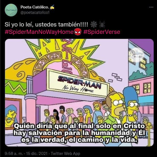 Todos los fans del Universo Cinematográfico de Marvel (UCM) están felices porque “Spider-Man: No way home” se estrenó este miércoles en los cines mexicanos y de algunas partes del mundo, a la par de un nuevo episodio de la serie que se transmite por Disney+, “Hawkeye”.Esto ha provocado cientos de reacciones a través de redes sociales, donde muchos comparten su entusiasmo tras haber visto la película.De acuerdo con datos de Cinépolis, “Spider-Man: No way home” se convirtió en la preventa más grande en la historia de la empresa, superando a “Avengers: Endgame” con 11 mil asistentes más. En total, según la empresa mexicana, la preventa para la película protagonizada por Tom Holland cerró en 2 millones 842 mil 500, quienes acudirán a partir de este miércoles a las salas de cine.Durante la alfombra roja de “Spider-Man: No way home” —que se celebró este lunes en Los Ángeles— algunos medios especializados estadounidenses pudieron ver la película y compartir sus críticas.Es el caso de Rotten Tomatoes quien, hasta este momento, la película “Spider-Man: No way home” tiene un 95 % de aprobación en su “tomatometer” con 116 críticas. Por su parte, IMDb califica a la película de John Watts con 9.3 de 10, con más de 4.3 mil críticas.Finalmente, John Defore —de The Hollywood Reporter— escribió en su reseña que “Peter sufre aquí (en la película), perdiendo tanto que corre el riesgo de perder también el espíritu. (...) Hay una ligereza en la escena final de la película que da esperanza”.Amelia Emberwing de IGN dijo que la película es “una armonía perfecta de una caricatura del sábado por la mañana y el drama profundo que esperamos de estas epopeyas”.Quizá algo similar a lo que Germain Lussier de Gizmodo, quien la calificó como una película “inmensamente satisfactoria”. “Spider-Man: No way home” es la mejor película en live-action que se ha hecho sobre el héroe arácnido, opinó Erik Favis, de Fandango.A través de redes sociales se seleccionaron algunas opiniones sin spoilers de nuestros lectores que ya vieron la película de Marvel y esta tarde las compartimos contigo: A través de redes sociales el título de “Spider-Man: No way home”, así como “Spider Verse” y “Perter Parker” se hicieron tendencia rápidamente. Hay que recordar que Sony y Marvel han pedido a los fans que ya vieron la película no revelar spoilers, haciendo tendencia #AdiósTwitter para quienes afirman que dejarán las redes sociales para no ver detalles de la película.No obstante, para lo que continúan dentro de las redes sociales, se destacan los siguientes comentarios que no compartieron spoilers para arruinar la película a los demás:“Al fin se puede utilizar este meme”, escribió un usuario, haciendo referencia a una escena de la película “Chicas pesadas”. Alguien más escrbió: “Yo despues de ver todos los spoilers”.AC