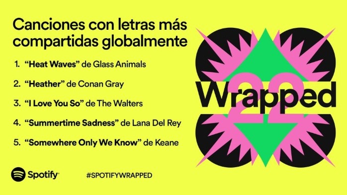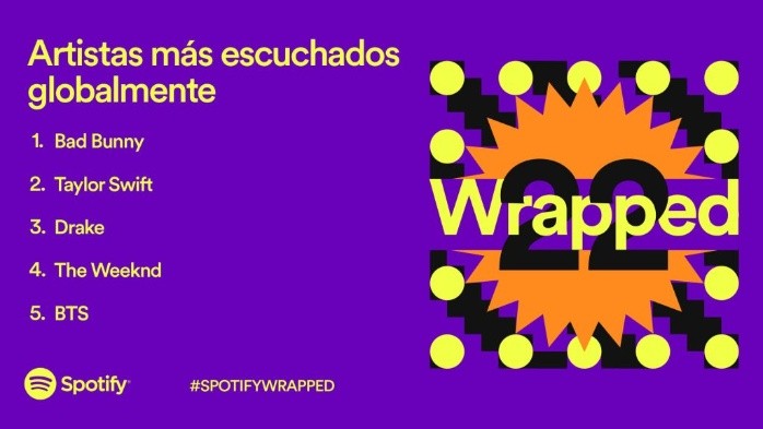 No hay una sola forma de definir lo que ha sido el 2022. El volver luego de algunos años de incertidumbre tras la pandemia, nos ha llevado a que cada quien cree una “nueva normalidad” en nuestras relaciones con la cultura, y entre nosotros. Este año, los oyentes de Spotify aprovecharon para redefinir lo que les apasiona. Y ahora es tiempo de relevar lo que colectivamente cautivó y obsesionó a todo el mundo en la suma de todos los “Mi 2022 en Spotify”. Es un tricampeonato para Bad Bunny. El cantante y compositor es el artista más escuchado del mundo en Spotify, un lugar que mantiene desde el 2020. Ningún otro artista ha logrado esa hazaña antes. El artista boricua también fue el más escuchado en todos los países hispanohablantes de Latinoamérica.Taylor Swift llegó a tiempo a la cita con sus fans a medianoche, y eso la impulsó a convertirse en la segunda artista más reproducida del año globalmente, y en el primer lugar de Australia, el Reino Unido, Irlanda, Malasia, Filipinas, Nueva Zelanda, Qatar, Eslovenia y Singapur. Completando los cinco artistas más escuchados están las dos potencias de Toronto, Drake y The Weeknd, junto con la banda de K-Pop BTS. El creador de la canción del verano de 2022, Harry Styles, se lleva el codiciado honor de tener la canción más reproducida en todo el mundo con su éxito “As It Was”. La canción “Heat Waves” de la banda británica de indie rock Glass Animals es la segunda canción más escuchada de 2022, y los fanáticos simplemente no tienen suficiente. La colaboración del artista australiano The Kid LAROI con Justin Bieber en “STAY” es la tercera canción más reproducida del año. “Me Porto Bonito” feat. Chencho Corleone y “Tití Me Preguntó” de Bad Bunny ocupan el cuarto y quinto lugar, respectivamente.Ahora bien, ¿qué obra en formato álbum, se escuchó más en 2022? Del español al inglés, del pop al hip-hop, los oyentes de todo el mundo mostraron una variedad de gustos. “Un Verano Sin Ti” de Bad Bunny ocupa el primer lugar como el álbum más reproducido a nivel global para 2022. “Harry’s House” de Harry Styles ocupa el segundo lugar. El álbum debut de Olivia Rodrigo, “SOUR”, ocupa el tercer lugar como álbum más escuchado. El álbum “=” de la superestrella del pop británico Ed Sheeran sigue siendo un favorito de los fans en el número cuatro. Finalmente, el álbum “Planet Her (Deluxe)” de la rapera y cantante estadounidense Doja Cat ocupa el quinto sitio.Este año, la oferta de podcasts de Spotify se expandió a nuevos mercados, brindando a más oyentes de todo el mundo nuevos programas para maratonear. Con más de cuatro millones de podcasts, la plataforma ofrece algo para cada tipo de oyente de podcasts. Pero, ¿qué programas dejaron su huella especialmente en 2022? A nivel mundial, el podcast más popular por tercer año consecutivo es The Joe Rogan Experience. Call Her Daddy, de Alex Cooper, ocupa el lugar del segundo podcast más popular. Anything Goes with Emma Chamberlain, una futura exclusiva de Spotify que toca una variedad de temas de la popular creadora estadounidense, ocupa el tercer lugar, mientras que Caso 63, un podcast original de Spotify que se estrenó en español, portugués brasileño, hindi, y el inglés ocupa el cuarto lugar con todas sus iteraciones de idiomas combinadas. Crime Junkie, un podcast sobre crímenes reales de Ashley Flowers y Brit Prawat, completa la lista como el quinto podcast más popular.1.- Bad Bunny 2.- Taylor Swift 3.- Drake 4.- The Weeknd 5.- BTS1. Un Verano Sin Ti by Bad Bunny 2.- Harry’s House by Harry Styles 3.- SOUR by Olivia Rodrigo 4.- = by Ed Sheeran 5.- Planet Her by Doja Cat1.- “As It Was” by Harry Styles 2.- “Heat Waves” by Glass Animals 3.- “STAY (with Justin Bieber)” by The Kid LAROI 4.- “Me Porto Bonito” by Bad Bunny feat. Chencho Corleon 5.- “Tití Me Preguntó” by Bad Bunny Los podcasts más populares globalmente 1.- The Joe Rogan Experience 2.- Call Her Daddy 3.- Anything Goes with Emma Chamberlain 4.- Case 63 (All Languages) 5.- Crime Junkie 1.- BTS 2.- BLACKPINK 3.- TWICE 4.- Stray Kids 5.- SEVENTEEN1.- “Heat Waves” by Glass Animals 2.- “Heather” by Conan Gray 3.- “I Love You So” by The Walters 4.- “Summertime Sadness” by Lana Del Rey 5.- “Somewhere Only We Know” by Keane1.- Taylor Swift 2.- The Weeknd 3.- Bad Bunny 4.- BTS 5.- Lana Del Rey *Artistas virales significa que su música se comparte con mayor frecuencia en las plataformas sociales desde Spotify1.- Sara James 2.- Shania Twain 3.- Evangelia 4.- Avril Lavigne 5.- Ethel CainFS