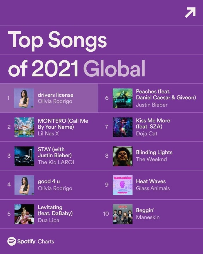 El pasado primero de diciembre, Spotify reveló cuáles fueron los artistas, canciones y álbumes más escuchados en la plataforma este 2021. La publicación de estos datos se lanzó simultáneamente al esperado Spotify Wrapped, una función de Spotify que revela a cada usuario cuáles fueron sus canciones y cantantes más escuchadas a nivel individual.La canción con más reproducciones en Spotify este 2021 fue "drivers license" de la cantante de 18 años Olivia Rodrigo. Éste fue el primer sencillo de su álbum debut, se estrenó el 8 de enero de 2021 y encabezó rápidamente las listas de reproducción de Billboard.El primero de muchos éxitos con el que Olivia Rodrigo saltó rápidamente a la fama. "drivers license" superó a "MONTERO" de Lil Nas X, "STAY" de The Kid LAROI y Justin Bieber, "good 4 u" de Olivia Rodrigo y "Levitating" de Dua Lipa, que ocupan las siguientes posiciones en ese orden.El puertorriqueño Bad Bunny logró por segundo año consecutivo coronarse como el artista más escuchado de Spotify a nivel global, con más de 9 mil 100 millones de reproducciones en la plataforma.En el listado lo suceden Taylor Swift, BTS, Drake, Justin Bieber, The Weeknd, J Balvin, Ariana Grande, Olivia Rodrigo y Juice WRLD en ese orden.La joven Olivia Rodrigo se ha convertido, éxito tras éxito, en una de las artistas más exitosas del momento. Su álbum debut "SOUR" fue por lejos el más escuchado en Spotify este 2021, y sus sencillos "drivers license" y "good 4 u" figuran de manera individual en la lista de las canciones con más reproducciones. MR