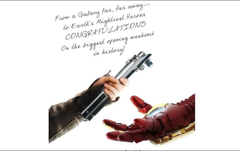 A través de las redes sociales, "Star Wars" felicitó a Marvel Studios por el éxito en taquilla de su película "Avengers: Infinity War", la cual en su fin de semana de estreno mundial alcanzó la cifra 640.9 millones de dólares.En un tuit, la cuenta oficial de "Star Wars" publicó una imagen en la cual se observa la mano de uno de sus personajes entregándole un sable de luz, a modo de batuta, a "Iron Man", del que igualmente solo se aprecia la mano.La frase traducida del inglés por la cuenta de Star Wars Latinoamérica señala: "De una Galaxia muy, muy lejana... a los héroes más poderosos de la tierra ¡Felicitaciones! En el lanzamiento más grande de fin de semana en la historia.El texto de la imagen está firmado por Kathy (Katheleen Kennedy), presidenta de Lucas Film) y todo su equipo, y en el mensaje arroban las cuentas de Marvel Studios y Avengers, junto con el hastag #InfinityWar.Tan solo en su estreno en México, "Los Vengadores" lograron recaudar en taquilla 171 millones 564 mil 762 pesos, con una asistencia de 2.9 millones de espectadores; mientras que a nivel mundial en su primer fin de semana alcanzó la cifra 640.9 millones de dólares.Con este mensaje el equipo del cineasta George Lucas continúa con la tradición iniciada por Steven Spielberg, quien en 1977 los felicitó por el romper récord de taquilla con "La Guerra de las Galaxias", superando así al filme "Tiburón".JB
