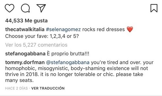 El diseñador italiano Stefano Gabbana enfrenta una nueva polémica luego de llamar "fea" a la cantante estadounidense Selena Gomez.La cuenta de Instagram The Cat Walk Italia compartió un collage de cinco fotografías de Selena portando vestidos rojos y preguntaron cuál era el look favorito.Entonces Stefano Gabbana respondió "es realmente fea", lo que de inmediato generó indignación entre los seguidores de la cantante.La publicación en Instagram tiene más de cuatro mil 800 comentarios que, en su mayoría, atacan al diseñador italiano por haber expresado su opinión sobre Selena.No es la primera vez que Stefano Gabbana se mete en problemas por mostrar su postura respecto de algún tema.En alguna ocasión tanto él como Domenico Dolce expresaron su oposición a las bodas entre personas del mismo sexo. "La única familia es la tradicional", aseguraron y también mostraron su rechazo a la concepción vía vientre de alquiler o fertilización in vitro.JB