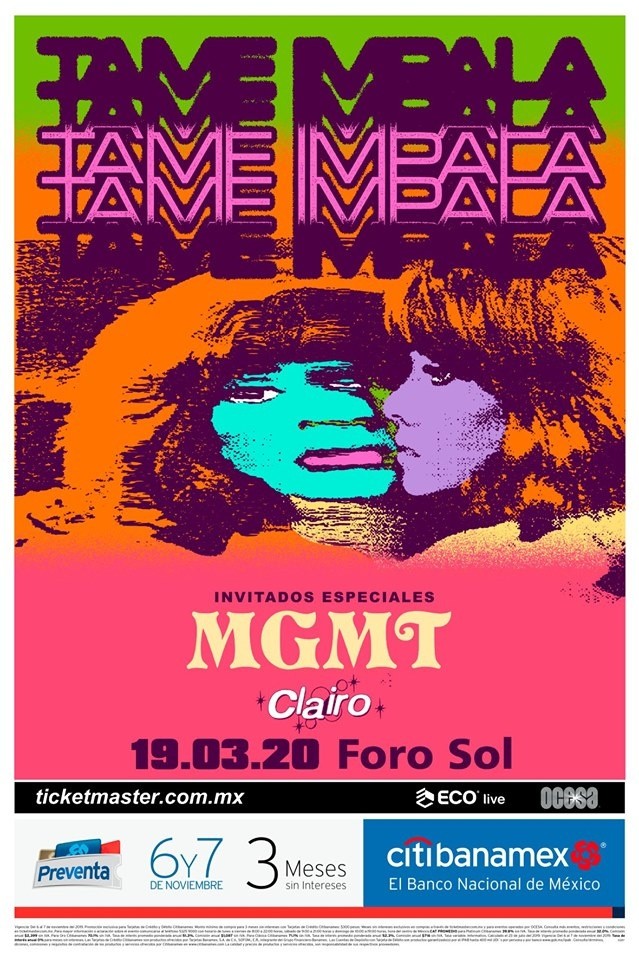Tras el anuncio del Line Up del festival Tecate Pa´l Norte en Monterrey donde Tame Impala y MGMT forman parte del listado, ambos grupos han anunciado un concierto, sumándose también la banda Clairo como invitado especial.Las bandas de indie rock ofrecerán un show el 19 de marzo de 2020 en el Foro Sol de la Ciudad de México, es decir, un día antes de su presentación en el festival Tecate Pa´l Norte. El regreso de Tame Impala a la ciudad capitalina supone la presentación de su cuarto álbum de estudio “The Slow Rush”, a lanzarse el próximo año.La preventa de boletos para los usuarios de Citibanamex será el próximo 6 y 7 de noviembre a través del sistema Ticketmaster. La venta al público en general será a partir del 8 de noviembre. El grupo MGMT se convirtió en la primera banda revelada por el Tecate Pa´l Norte, al día siguiente los organizadores compartieron la lista completa donde The Strokes y Tame Impala se impusieron como headliners, acompañados por artistas como Alejandro Fernández, Foster The People y Morat, entre otros muchos más. AC