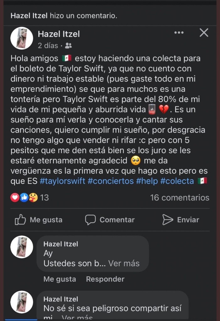 La fiebre por Taylor Swift en México ha llevado a los fans a intentar de todo para obtener un boleto para alguna de las cuatro fechas que ofrece la cantautora en Ciudad de México.Pese a que Ticktmaster exigió un registro previo al inicio de la venta de boletos para alguno de los conciertos, hubo fans que estuvieron dispuestos a hacer de todo para obtener recursos para adquirir entradas para el Foro sol.En redes sociales se viralizó la publicación de una mujer que se identificó como una verdadera "swiftie", palabra con la que se conoce a los fans de la cantante originaria de Pensilvania, Estados Unidos.La usuaria que en redes sociales aparecía como Hazel Itzel escribió una publicación en la que aseguraba que estaba haciendo una colecta, dado que no cuenta con recursos debido a su emprendimiento.La usuaria comentó que para ella sería un "sueño" conocerla y poner cantar sus canciones en alguno de los conciertos a realizarse entre el 24 y 27 de agosto en el Foro Sol."Por desgracia no tengo qué vender ni rifar :C pero con 5 pesitos que me den está bien se los justo que estaré eternamente agradecida. Me da vergüenza, es la primera vez que hago esto pero es que ES #TaylorSwift", publicó.La publicación se viralizó en redes sociales, donde los usuarios reaccionaron al fanatismo de la mujer: "No sé qué es más patético, si el hecho de limosnear para un concierto o que un cantante sea el 80% de tu vida"."¡Qué propuesta tan original y tentadora! Seguro que tus followers están más que dispuestos a financiar tu estilo de vida", se lee.Taylor Swift realizará cuatro conciertos consecutivos en el Foro Sol de Ciudad de México, entre el 24 y 27 de agosto. Es la primera vez que la intérprete de "Blank Space" y "Midnight Rain" se presenta en México.En un principio la cantautora nacida en Pensilvania anunció tres fechas para conciertos en el Foro Sol, sin embargo, este lunes 12 de junio dio a conocer una fecha extra para el 27 de agosto.MF