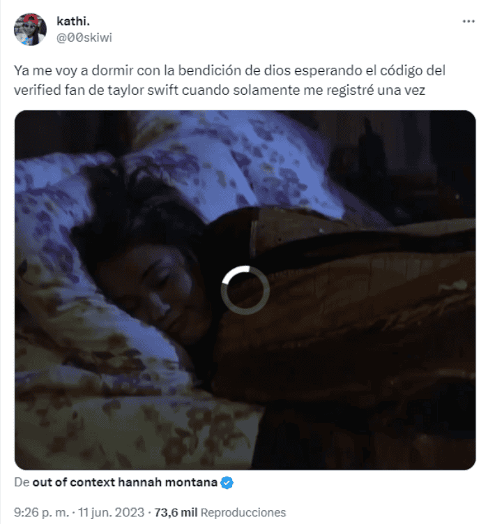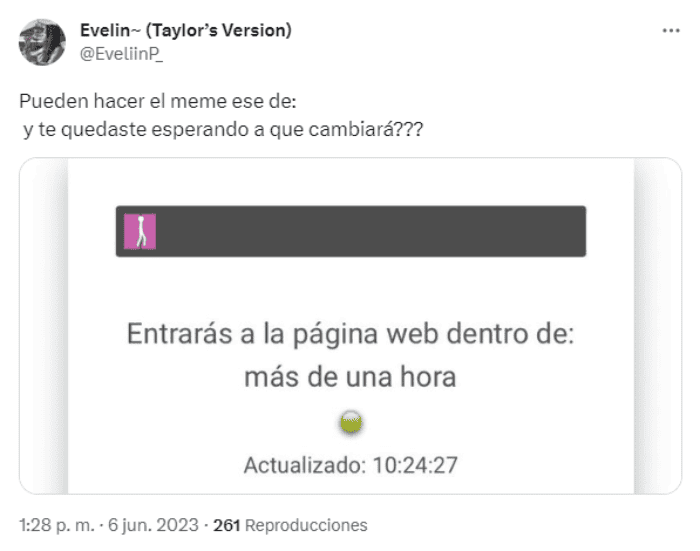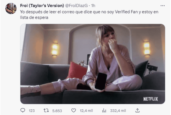 Luego de la noticia que dio la famosa cantante Taylor Swift por medio de sus redes sociales enloqueciendo a sus fans tras su llegada a la ciudad de México las fechas 24, 25, 26 y 27 de agosto de este año, se volvió un reto de “a ver quién se los gana primero”. Pues el concierto de Taylor es muy esperado por el público mexicano y en la medida de lo posible quieren obtener un asiento para disfrutar de su artista favorita. Por otra parte, la plataforma Ticketmaster pidió a los "swifties" hacer un "Verified Fan" para ingresar a la fila virtual, y así comprar entradas a los shows que va a brindar Taylor Swift el próximo mes de agosto en el Foro Sol de CDMX. LEE TAMBIÉN: ¡Ojo! Estas son las series y películas que desaparecerán de Netflix en julioSin embargo, las quejas a la empresa han sido recurrentes debido a la escasez de tickets a los conciertos al poco tiempo de activar la venta en el sitio oficial. Ya no se diga, tratándose de un concierto de gran demanda como lo es el de Taylor Swift. Cabe señalar, que Ticketmaster admite que los clientes registrados en el "Verified Fan" obtengan un correo electrónico con el código de acceso a la fila virtual. Aunque no es garantía que obtengan los boletos. El sistema estuvo hábil desde el pasado 2 de junio y finalizó el 5 del mismo mes, y en caso de no recibir el correo electrónico con el código para formarse en la fila virtual, los cibernautas pasarán a una lista de espera. Asimismo, este lunes 12 de junio los "Swift Lovers" comienzan a recibir el mail con la información necesaria para acelerar la ganga de los boletos. Finalmente, la emoción es máxima por ver a la intérprete de los siguientes sencillos musicales como: "Blank Space", "Bad Blood", "Karma", “Anti-Hero”, “Style”, “Cardigan” entre otras. A través de redes sociales hay quienes ya informaron haber conseguido el código. Mientras que otros fanáticos siguen en espera y esperan que Ticketmaster les haga llegar el pase para la fila virtual lo más rápido posible. Incluso, hasta hicieron memes referente a ello. A continuación, te los mostramos. SN