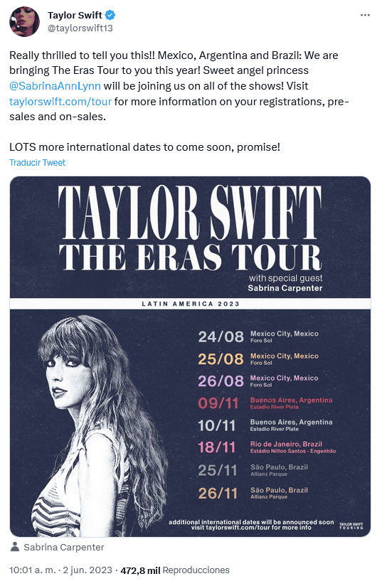 ¡No es un sueño! La cantante estadounidense Taylor Swift anunció no un concierto sino tres en la Ciudad de México como parte de su gira The Eras Tour.Esta será la primera vez que Taylor Swift llegue a México, pues durante sus giras anteriores no había visitado ningún país de América Latina. Por tanto, su visita será muy esperada por miles de fans de nuestro país.Los conciertos serán los días 24, 25 y 26 de agosto de 2023 en el Foro Sol. Durante varias semanas los seguidores de Taylor Swift estuvieron especulando sobre el anuncio de algún concierto en México, esperado ya por algunos años, y este día se confirmó que no sólo será uno sino tres los shows que la intérprete ofrezca en nuestro país.Este día también se pidió a los fans registrarse desde hoy y hasta el 7 de junio a las 11:59 de la noche hora de la CDMX para tener la oportunidad de participar en la venta. El acceso será prioritario para residentes de México. Los fans que reciban un correo electrónico confirmando su acceso podrán unirse a la fila a partir del 13 de junio.En su página oficial, Taylor Swift anunció fechas en Argentina y Brasil, aunque estas en el mes de noviembre.Taylor Swift estrenó hace algunas semanas cuatro canciones como parte de una "celebración" previa a su gira "The Eras Tour"."The Eras Tour" es la nueva gira internacional de la cantante estadounidense, la primera en cinco años. Swift comenzó su camino en la ciudad de Glendale, Arizona, cuyo nombre cambiará por el de Swift City, durante dos días en honor a la intérprete de "Fearless".Con su último álbum, "Midnights", que salió a la venta en octubre, Swift se convirtió en la primera artista musical en la historia en conseguir los 10 primeros puestos de la lista de 100 canciones del Billboard Hot 100, y el disco fue el más escuchado de Spotify en un sólo día.OF