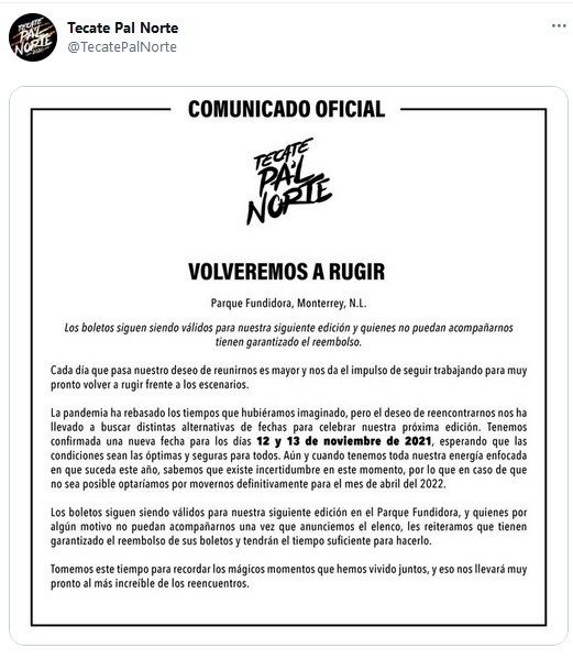Después de que se cancelara el año pasado por la pandemia de COVID-19, el Festival Tecate Pa'l Norte anunció las fechas para su edición 2021.A través de un comunicado en sus redes sociales, los organizadores señalaron que los días 12 y 13 de noviembre de 2021 se realizará el festival "esperando que las condiciones sean óptimas y seguras para todos".También indicaron que los boletos que fueron comprados anteriormente seguirán teniendo validez y "quienes por algún motivo no puedan acompañarnos una vez que anunciemos el elenco tendrán el reembolso".Hasta el momento se desconce los artistas y grupos que estarían en el festival que se lleva a cabo en el Parque Fundidora en Monterrey.Pa'l Norte 2020 iba a ser la novena edición del festival, el cual contaba con The Strokes y Tame Impala como los actos principales. Cabe destacar que por la contingencia sanitaria por el coronavirus, en México se han cancelado los conciertos y eventos masivos para detener la propagación del virus.jb