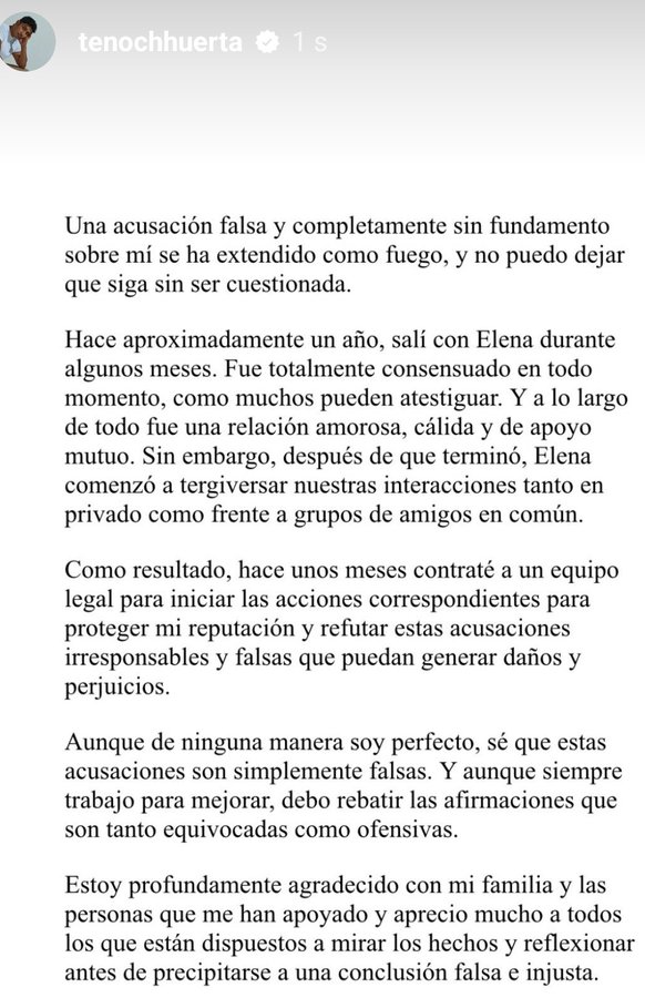 Tenoch Huerta se vio atrapado en la polémica luego de que la saxofonista María Elena Ríos lo acusara de ser un “depredador sexual”. “Es muy difícil hablar del abuso emocional y abuso de poder de un depredador sexual que es amado en el mundo por interpretar a un personaje de una película como @TenochHuerta”, escribió la saxofonista en sus redes sociales.Durante el fin de semana Tenoch Huerta no se había pronunciado al respecto, pero este lunes el actor, a través de sus historias de Instagram, lanzó un comunicado en el que expresa su sentir en torno a la controversia. "Una acusación falsa y completamente sin fundamento sobre mí se ha extendido como fuego, y no puedo dejar que siga sin ser cuestionada", escribió el actor.Tenoch Huerta confirma que hace poco más de un año "salió" con la saxofonista Elena, en una relación consensuada, amorosa y de apoyo mutuo. No obstante, cuando el vínculo terminó, Tenoch Huerta afirma que Elena "comenzó a tergiversar nuestras interacciones".Tenoch también indica en su comunicado que ha acudido a un equipo de especialistas para tomar las medidas correspondientes, derivadas de "acusaciones irresponsables y falsas que puedan generar daños y perjuicios"."Aunque de ninguna manera soy perfecto, sé que estas acusaciones con completamente falsas", afirma el actor, quien interpretó a Namor en la película de Marvel "Black Panther: Wakanda Forever".Del mismo modo, Tenoch Huerta agradeció a las personas que lo han apoyado durante esta controversia. FS