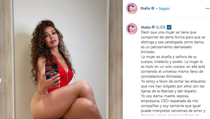 Thalia envió un mensaje de empoderamiento femenino, a través de sus redes sociales, acompañado de unas fotos que han impactado a sus seguidores por el drástico cambio físico en su rostro y piernas.Con la frase "La mujer es dueña y señora de su cuerpo", la cantante compartió una reflexión en su cuenta de Instagram en donde pide cortar las etiquetas que la sociedad le ha impuesto a la mujer a través del tiempo."La mujer es dueña y señora de su cuerpo, intelecto y poder. La mujer lo es todo en un solo cuerpo, en ella está contenido el universo mismo lleno de constelaciones ilimitadas. Yo estoy a favor de cortar las etiquetas que nos han colgado por años con las tijeras de la libertad y del respeto", puntualiza.También comenta que como mujer es libre de hacer muchas cosas, entre ellas, subir contenido provocador o religioso a sus redes, sin que se le juzgue por ello."Yo soy dama, madre, esposa, empresaria, CEO respetada de mis compañías y soy cantante que igual puede interpretar canciones de amor y desamor, como canciones llenas de contenido sexy y provocativo. Mi alma puede a la vez interpretar canciones para niños tocando mi lado materno, como mi voz puede cantar alabanzas de agradecimiento a Dios", señala.También comenta que como influencer tiene el derecho de subir contenido sexual a sus redes sociales."Soy influencer de redes sociales y del mismo modo puedo subir una foto totalmente provocativa y sexual como una foto con mi marido e hijos. Una cosa no quita la otra. Todo coexiste en una experiencia llamada mujer", expresa.El mensaje de la cantante fue acompañado por dos fotografías en traje de baño, que lo opacaron, debido a que se nota un notorio cambio físico muy drástico, como el aumento de volumen de los labios y de piernas.Algunos de sus seguidores señalan que se realizó una cirugía plástica que no necesitaba, otros criticaron fuertemente a la también actriz, señalando que se ve más grande de edad, que si ya quería sentirse como las Kardashian y algunos la confundieron con la Chiquis Rivera.jb