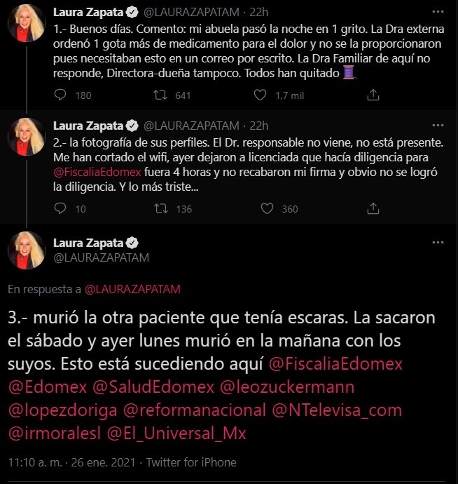 Pese a que Doña Eva Mange —abuela de Thalía y Laura Zapata— continúa su recuperación en el asilo para ancianos Le Grand Senior Living, las quejas no paran, pues le han negado medicamentos a la mujer de 103 años de edad, quien fue encontrada por su nieta Laura Zapata con siete escaras en la piel hace unas semanas.Laura inició una carpeta de investigación contra la enfermera que atendía a su abuelita y contra quienes resultaran responsables. Laura entró al asilo Grand Senior Living después de unos días de cuarentena, y desde allí se ha enfocado en que su abuelita se recupere, pero al parecer las cosas solamente se van agravando.Thalía dijo en en redes sociales que "No entiendo por qué en Le Grand Senior Living, no le dieron anoche a mi abuela sus medicamentos, no se dan cuenta que se siente mal paso la noche en un grito del dolor y todo porque tienen que mandarnos un email solicitándolo, por favor, en ocasiones se reacciona por amor, !No le hagan daño!".Laura también se pronunció al respecto e informó del fallecimiento de otra huésped de este costoso asilo. "Murió la otra paciente que tenía escaras. La sacaron el sábado y ayer lunes murió en la mañana con los suyos. Esto está sucediendo aquí", escribió en Twitter."Comento: mi abuela pasó la noche en 1 grito. La Dra externa ordenó 1 gota más de medicamento para el dolor y no se la proporcionaron pues necesitaban esto en un correo por escrito. La Dra Familiar de aquí no responde, Directora-dueña tampoco", detalló Zapata.Agregó que se practicó este día una inspección con diferentes dependencias de gobierno, entre ellas la Comisión de Derechos Humanos del Estado de México, el INVEA (Instituto de Verificación Administrativa del Estado de México), entre otras.Hasta ahora, el lugar no se ha pronunciado al respecto.AC