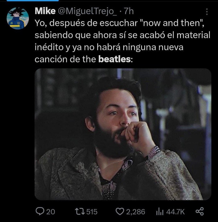 Este jueves se lanzó la canción inédita de The Beatles "Now And Then", producida con ayuda de la Inteligencia Artificial.Dicha tecnología permitió a los técnicos tomar la cinta original de John Lennon de finales de los años 70 y extraer su voz, con precisión quirúrgica, para que suene nítida y profesional.El resultado de la canción es un híbrido en el que podemos escuchar a los fallecidos Lennon y George Harrison (cuya guitarra eléctrica y acústica se grabó en 1995), una nueva parte de batería de Ringo; el bajo, el piano y la guitarra de Paul McCartney.Ante ello, usuarios de la plataforma X, antes Twitter, reaccionaron al respecto, mostrándose un tanto nostálgicos por la nueva canción.Asimismo, algunos internautas saben que se trata la última canción oficial de la legendaria banda británica.Mantente al día con las noticias y únete a nuestro canal de WhatsApp.MM