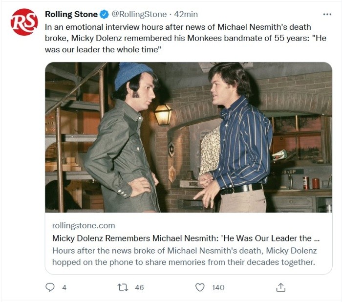 A mediados de los años 60, ante el amplio dominio de las bandas inglesas, un grupo de productores estadounidenses decidió hacer frente a esa ola musical con un conjunto de cuatro jóvenes que cargó mucho tiempo con la etiqueta de prefabricado. Entre ellos destacaba Michael Nesmith, quien murió este viernes a la edad de 78 años.La familia de Nesmith informó que el músico murió este viernes en su casa de California de causas naturales, señaló la revista Rolling Stone en su sitio oficial.The Monkees, grupo conformado con un objetivo netamente comercial, estaba pensado para acompañar un programa de televisión, por lo que sus integrantes (Micky Dolenz, Davy Jones, Peter Tork y Michael Nesmith) fueron seleccionados de un amplio casting; sin embargo, Nesmith se destacó no sólo por llevar siempre un gorro de lana verde, sino por su talento para componer canciones.Entre 1966 y 1970 la banda fue capaz de ligar éxitos musicales y ganar fama gracias a canciones de grandes compositores como Neil Diamond, Carole King, Jeff Barry y Neil Sedaka, volviéndose muy populares en una etapa donde los grupos ingleses dominaban el mundo del pop, e incluso para muchos fueron rivales directos de The Beatles, aunque entre los críticos especializados su nivel nunca estuvo a la par.Michael Nesmith peleó siempre por quitarse esa etiqueta de ser simplemente un actor con guitarra y logró que The Monkees grabaran composiciones suyas, como "Mary, Mary", "Listen to the Band" y "The Girl I Knew Somewhere", además de que le dio la canción "Different Drum" a la banda Stone Poneys, donde debutó la cantante Linda Ronstadt.Con el deceso de Nesmith, es Micky Dolenz el último sobreviviente de The Monkees, pues Davy Jones murió en 2012 y Peter Tork en 2019.JM