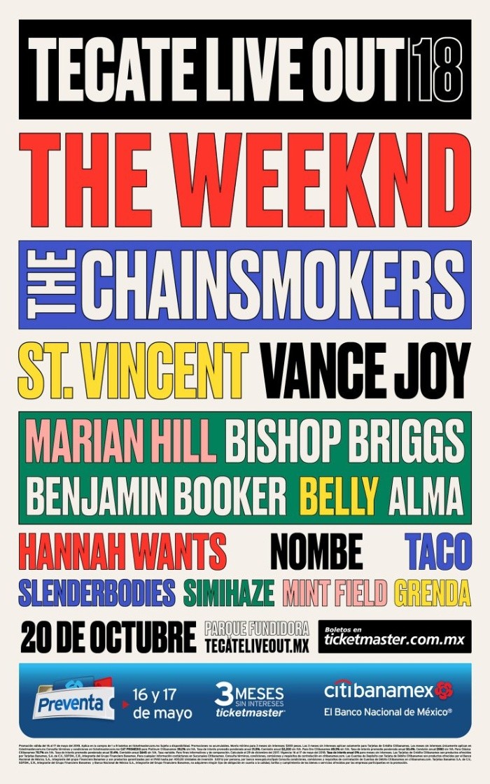 La tarde de este lunes el Festival Tecate Live Out reveló a través de sus redes sociales su cartel para su edición 2018 en el que lidera The Weeknd.The Chainsmokers, St. Vincent, Vance Joy, Marian Hill, Bishop Briggs, Benjamin Booker, Belly, Alma, Hannah Wants, Nombe, Taco, Slenderbodies, Simihaze, Mint Field y Grenda completan el line up del festival.La tercera edición del Live Out se realizará en el 20 de octubre en el Parque Fundidora en Monterrey, Nuevo León. La Preventa Citibanamex será el 16 de mayo y la venta general de boletos comienza el 18 de mayo.La noticia llega después de que hace algunas semanas el cantante canadiense anunció su primer concierto en la Ciudad de México que se llevará a cabo el próximo 22 de octubre de 2018 en el Palacio de los Deportes.JB