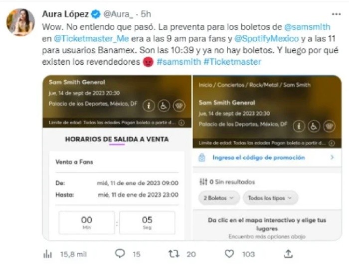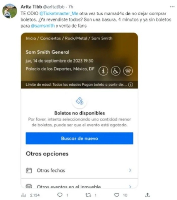 Una vez más la compañía de ventas y de distribución de boletos Ticketmaster se encuentra en el ojo del huracán, luego de que este miércoles se presentaron varios problemas en su plataforma para que los usuarios pudieran comprar boletos para los conciertos de Sam Smith en México.Fue a través de la red social de Twitter en donde miles de fans reportaron fallas en la operación de la página web de Ticketmaster, pues mencionaron que la opción de boletos disponibles duró apenas unos minutos y de la nada apareció el mensaje de: "boletos no disponibles". Este miércoles 11 de enero comenzó la preventa de boletos para todos los usuarios que recibieron código en Spotify, además para cuentahabientes con beneficios selectos.En las quejas de los usuarios se lee que en los primeros minutos de la venta de boletos estos ya se habían supuestamente agotado."Según Ticketmaster en 2 minutos se acabaron los boletos para Sam Smith en la preventa para fans", se lee en un tweet publicado por el usuario @manhuel.Mientras que la especialista en tecnología Aura López, quien también estaba en busca de entradas para el concierto publicó: "si las preventas duraron 3 minutos y muchos no alcanzamos nada, ¿qué esperar de la venta general Serán los revendedores? Tendrá Ticketmaster una "alianza" con ellos? Será fraude, mafia o mera casualidad que se acabaron los boletos de Sam Smith? (sic)".Sam Smith regresa a México este 2023 como parte de su gira "Gloria", para presentarse en Ciudad de México y Monterrey.En Ciudad de México, el cantante británico se presentará en el Palacio de los Deportes el próximo 14 de septiembre.Los boletos saldrán a la venta dentro de unos días para usuarios en general.Si al comprar tus boletos estos son cancelados por Ticketmaster de forma unilateral o fuiste afectado por la negativa a la devolución del monto pagado deberás presentar la siguiente documentación:MF