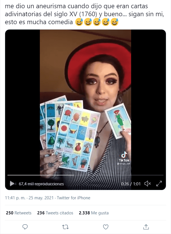 Un uso alternativo de la lotería tradicional mexicana está en el ojo del debate entre usuarios de redes sociales luego de que una tiktoker de origen puertorriqueño compartiera los propósitos adivinatorios del juego a manera de tarot.La usuaria, quien se hace llamar @bruja_cat en TikTok inicia un video en dicha red social explicando que recientemente le habían solicitado material sobre el “tarot mexicano” por lo que muestra un puñado de cartas que conforman la lotería y procede a dar el contexto histórico del juego, que a su decir data del siglo XV.Posteriormente explica el ampliamente difundido uso de la lotería como juego de mesa, añadiendo que al jugarlo las personas tienen que adivinar la imagen que deben marcar con base en el acertijo escrito en la descripción al reverso de cada carta; hace énfasis en que todos ignoran el número en la esquina superior de cada imagen.La usuaria separa incluso algunas cartas de la lotería tradicional indicando una gran similitud a otras de los arcanos mayores y en otro segmento del video muestra un puñado de cartas asociadas a la cultura mexicana indicando que éstas tienen propósitos adivinatorios.“Ayer en Tiktok una morra Dominicana (sic) hizo un video de “me han pedido que hable sobre el tarot mexicano y pues por fin conseguí las cartas” y yo dije ahcaray eso me interesa.jpg”, se lee en la imagen que comparte en Twitter la usuaria @trementyna.Tras la publicación de este video en Twitter, usuarios comenzaron a compartir sus impresiones sobre el material; algunos en tono de burla al no dar crédito a lo que veían y escuchaban, mientras otros apostando a que la lotería tradicional mexicana sí puede ser interpretada como una versión del tarot. Entre los comentarios hay quienes comparten incluso, experiencias graciosas en las que bromearon con alguien “leyendo” cartas de la lotería resultando en atinadas coincidencias.“Me dio un aneurisma cuando dijo que eran cartas adivinatorias del siglo XV (1760) y bueno... sigan sin mi, esto es mucha comedia (sic)”, compartió @trementyna en un tuit en el que incluye el momento de la explicación.