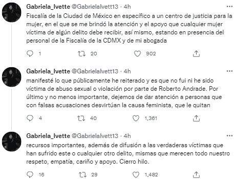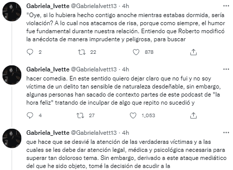 A través de Twitter, Gabriela Ivette, identificada con el usuario @GabrielaIvett13, niega que el comediante y cineasta Roberto Andrade, mejor conocido en el mundo del standup como “Tío Rober”, la haya violado mientras ambos compartían una relación sentimental que duró ocho años, según explica en su relato.Gabriela señala que durante su noviazgo con “Tío Rober”, ambos construyeron una historia basada en el amor, respeto y “siempre con la libertad, por parte de ambos, de externar aquellas cosas que en algún momento no estuviera de acuerdo”, comenta al referir que su testimonio va a enfocado a las declaraciones que dijo el standupero en su podcast “La hora feliz”, en donde recordó que en algún momento pretendió tener relaciones sexuales con su ex pareja mientras ella estaba dormida, aunque puntualizó que había consentimiento de por medio.“Durante el podcast de ‘La hora feliz’, se tocó el tema sensible de la violación. Relatando una historia en donde se infiere que se cometió este delito contra mi persona. Él no mencionó mi nombre real, pero a raíz de las acusaciones falsas que le hicieron en relación a este episodio, tuve que revelar mi identidad y salir a desmentir dichas acusaciones en contra de Roberto”, explica Gabriela Ivette.La polémica que envuelve ahora al “Tío Rober” surge a raíz de que una joven denunció en redes sociales haber sido abusada por el comediante, hechos que han derivado en que la presentación del standupero en el próximo Festival Vive Latino fuera cancelada.En su testimonio, la ex pareja del “Tío Rober” recuerda que ese episodio, referente a la supuesta violación, ambos bebieron y con la intención de tener relaciones sexuales consensuadas “yo me quedé dormida primero, por lo cual no tuvimos ningún contacto sexual”, detalla Gabriela al puntualizar que su ex pareja le preguntó al día siguiente sobre lo sucedido, “él me pregunto: ‘¿Oye, si lo hubiera hecho contigo anoche mientras estabas dormida, sería violación?’ A lo cual nos atacamos de risa, porque como siempre, el humor fue fundamental durante nuestra relación”.Gabriela añade que la forma en cómo Roberto charló ese momento a su audiencia fue “imprudente y peligrosa” con el fin de hacer comedia.“En este sentido quiero dejar claro que no fui y no soy víctima de un delito tan sensible de naturaleza desdeñable, sin embargo, algunas personas han sacado de contexto partes de este podcast de “la hora feliz” tratando de inculpar de algo que repito no sucedió, que hace que se desvié la atención de las verdaderas víctimas y a las cuales se les debe dar atención legal, médica y psicológica necesaria para superar tan doloroso tema”.Ante las acusaciones señaladas contra Roberto Andrade, su expareja Gabriela destacó que optó por acudir a la Fiscalía de la Ciudad de México, al Centro de Justicia para la Mujer, para que le brindaran atención y apoyo, en compañía de su abogada.“Manifesté lo que públicamente he reiterado y es que no fui ni he sido víctima de abuso sexual o violación por parte de Roberto Andrade. Por último y no menos importante, dejemos de dar atención a personas que con falsas acusaciones desvirtúan la causa feminista”, apuntó Gabriela al enfatizar que los recursos en estos casos deben encausarse a las víctimas.El testimonio de Gabriela como ex pareja del “Tío Rober” causan discusión entre los internautas, por una parte, con quienes celebran que brinde su testimonio, otros que indican que esta aclaración no reduce la experiencia de la joven que acusó al standupero, en tanto que otros usuarios sugieren que el comediante debe buscar a mujeres de su edad y no a jovencitas.AF