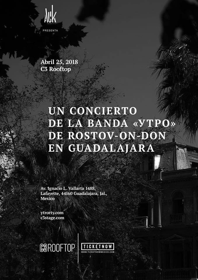 UTRO, el proyecto alterno de los integrantes de la banda post punk rusa, Motorama, llega a Guadalajara el 25 de abril al C3 Stage.'Утро' (utro en ruso) apuestan por un sonido experimental y por momentos gótico, sonidos que ellos mismos han dicho que la mejor hora para escuchar sus discos es a la medianoche.Otra característica de Utro, son las letras en su idioma natal ruso, con lo cual plasman aún mejor la melancolía de sus ideas. En sus inicios, la banda no usaba sus nombres, sólo iniciales de los integrantes para dar cierta individualidad a este nuevo proyecto que no querían ver opacado por la sombra de Motorama, pero con el paso de los años, UTRO ha consolidado su propia identidad de carácter existencial y minimalista. UTRO en Guadalajara / Boletos Preventa: $200 Día del evento: $250