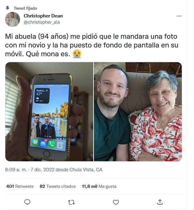 Una abuelita enterneció las redes sociales luego de un gesto que tuvo con su nieto y el novio de este al pedirle una foto donde salieran ambos."Mi abuela (94 años) me pidió que le mandara una foto con mi novio", dijo el usuario de Twitter, Christopher Dean quien acompañó la publicación con una foto de él junto con la mujer.El joven no se esperaba que la razón por a que ella le había pedido la foto era para algo muy especial."(...) la ha puesto de fondo de pantalla en su móvil. Qué mona es", escribió el joven, ganándose miles de likes y cientos de comentarios como: "Se nota que es una persona hermosa por dentro, porque también lo es por fuera. Besos a tu abuela" y "¡Solo el amor puede cambiar y tu abuela te ama! hermosa abuela".vll