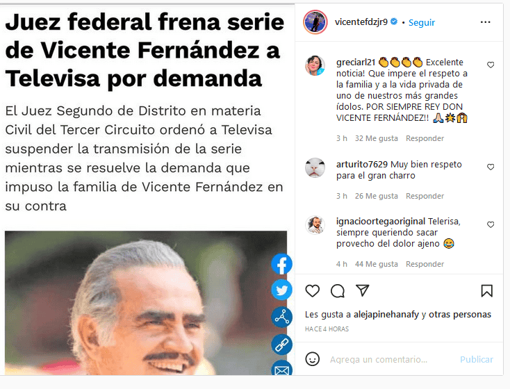 A través de sus redes sociales, Vicente Fernández Jr., hijo de Vicente Fernández, compartió la noticia sobre el freno que tendrá la próxima serie de "El último rey: el hijo del pueblo", que produce Televisa y la cual tendría intenciones de estrenarse este lunes 14 de marzo en el horario estelar nocturno del Canal de las Estrellas.Medios como El Universal revelaron que el Juez segundo de Distrito en materia Civil, pidió a Televisa no transmitir la serie que será protagonizada por Pablo Montero, pues la familia del "Charro de Huentitán" impuso una demanda para que el contenido no llegue a la pantalla, según fuentes cercanas al caso.Aunque Netflix y la televisora colombiana Caracol también están próximos a estrenar una serie basada en la vida de Vicente Fernández, teniendo a Jaime Camil como estrella para interpretar a "Chente", con autorización en vida del propio Vicente, en el caso de la producción de Televisa, la familia Fernández no habría dado su respaldo para que la vida del intérprete de "La ley del monte" fuera adaptada, pues está basada en "El último rey", libro biográfico no autorizado escrito por la periodista argentina Olga Wornat, quien repasa la trayectoria de Vicente Fernández y diversos episodios personales y familiares que involucran a los hijos del cantante con problemas legales y hasta supuestas relaciones con el crimen organizado.Respecto a la serie de Televisa, la familia de "Chente" solicitó apoyo a los juzgados para impedir que la serie "El último rey: el hijo del pueblo" se estrene, al alegar que este contenido no está autorizado por la familia y que además se incurren en diferentes faltas como el uso no autorizado de la marca de Vicente Fernández y el uso indebido del nombre artístico del "Charro de Huentitán" registrado ante el Instituto Nacional de Derechos de Autor (Indautor); ha trascendido que la familia Fernández también habría recurrido al Instituto Mexicano de la Propiedad Intelectual para evitar la transmisión de la producción de Televisa.Sin dar más detalles, Vicente Fernández Jr., solamente compartió una captura de pantalla de la nota difundida por diversos medios y el post ha recibido comentarios de seguidores de la familia Fernández que celebran que dicha serie de Televisa no llegue a la pantalla con el fin de respetar los deseos de la familia, pues han resaltado que la televisora "busca hacer leña del árbol caído" tras el fallecimiento de Vicente Fernández el pasado 12 de diciembre del 2021.Hasta el momento, Televisa no ha mostrado una postura ante la supuesta demanda, sin embargo, en sus redes sociales sigue promocionando la serie "El último rey" que se proyecta tenga su estreno el 14 de marzo a las 20:30 horas (tiempo central de México) a través de El Canal de las Estrellas.Se espera que algunos miembros de la familia de Vicente Fernández estén presentes el día mañana, domingo 13 de marzo, en el acto que el Gobierno de Tlajomulco de Zúñiga, brindará para formalizar el cambio de nombre del Circuito Metropolitano Sur a "Circuito Metropolitano Vicente Fernández Gómez", en la cabecera municipal del municipio.OF