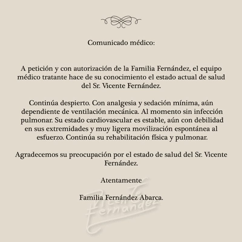Personal médico del hospital que atiende a Vicente Fernández, informó que a partir de este viernes 13 de agosto se brindarán dos reportes semanales sobre el estado de salud del cantante. Los días lunes y viernes, a las 16:00 horas, se tendrá el informe médico por parte de los especialistas.La directiva del nosocomio explicó que hasta el momento se contempla que el internista Luis Arturo Gómez Hernández sea quien tenga el acercamiento a la prensa, de acuerdo a lo compartido por Cecilia Rizo, asistente de dirección del hospital, esto ante la decisió de Vicente Fernández Jr. de tomar distancia de los medios de comunicación para evitar contagios, tomando en cuenta que uno de los accesos del nosocomio funge como unidad de atención COVID-19.Vicente Fernández Jr. acudió al día de ayer para visitar a su padre en el turno matutino y previo a su ingreso, ante la cantidad de medios de comunicación reunidos, decidió detener su camioneta en plena calle y bajarse para atender a los periodistas, sin embargo, ante la cantidad de preguntas y en su intento por hacerse escuchar ante los gritos de la prensa, en un descuido se quitó el cubrebocas.Trascendió que Vicente Jr. decidió ya no tener hoy acercamiento con la prensa a su llegada hospital, al considerar que quitarse el cubrebocas, por descuido, no solo se expuso a contagiarse o contagiar a los medios, sino que significa un peligro para su padre cuando ingresa a verlo a la habitación donde es atendido y donde también está por momentos Doña Cuquita Abarca, esposa de “Chente”.Cecilia Rizo, asistente de dirección del hospital, enfatizó que a partir de este viernes comenzará esta dinámica directa con personal médico autorizado, con la presencia de Gómez Hernández, del neurocirujano Francisco López González y el médico de la familia Roberto Esquivel Ruano, para brindar, de manera breve, información sobre la situación en la que Vicente Fernández se encuentra tas la cirugía de cervicales y que ha sido clave para su mejora.Aunque esta situación sobre los reportes médicos que se darán los días lunes y viernes no ha sido expresada directamente por la familia Fernández Abarca, diversas situaciones también han alertado al hospital sobre los riesgos de generar aglomeraciones en el exterior del hospital y sus principales accesos, pues desde el día de ayer se ha incrementado la visita de fanáticos que en sus intento por expresar su cariño y preocupación por Vicente Fernández, han decidido cantar un par de éxitos del “Charro de Huentitán” apoyados por pequeñas bocinas o totalmente a capella.Minutos antes de que iniciará el horario habitual de las visitas matutinas, la cantante Lola Montes, originaria de Los Ángeles, llegó a la entrada del hospital, acompañada por dos personas, con la intención de entregar un arreglo floral al artista, sin embargo, personal de seguridad le indicó que no era posible ingresar, por lo que acomodaron el obsequio en la entrada del nosocomio.Lola Montes, aunque no brindó detalles puntuales sobre su visita al hospital, cantó un par de éxitos como “Volver volver”, en señal de la admiración y cariño que tiene por Fernández, de quien ha recibido asesoría para impulsar su proyecto musical y tuvo permiso para filmar el video musical de “Lo que yo siento”, en el Cortijo de Los Fernández, en 2020.Ante estas situaciones, la directiva del hospital recalcó que es importante no alentar al público a venir al hospital por respeto y consideración a los demás pacientes y familiares que hacen uso de los servicios médicos, emergencias y atenciones por COVID-19.A través de redes sociales, la tarde de este jueves el equipo de Vicente Fernández publicó la actualización del estado de salud del cantante, quien permanece con sedación mínima.En el comunicado, se detalla que Fernández continúa despierto, aunque aún dependiente de ventilación mecánica. Al momento, su estado cardiovascular es estable, sin detectarse infección pulmonar; asimismo, presenta debilidad en sus extremidades y ligera movilización espontánea al esfuerzo.***Si te interesó esta noticia y quieres saber más, entonces descarga y descubre INFORMAPlus, la aplicación digital de EL INFORMADOR, en donde tenemos contenidos exclusivos, seleccionados por nuestros editores, para darles una experiencia más completa a los lectores.Descarga la aplicación y pruébala GRATIS por treinta días.Para iOS: https://apple.co/35jaVgbPara Android: https://bit.ly/3gwVSEVSi eres suscriptor de EL INFORMADOR tu acceso está incluido, solicítalo al 33 3678-7777AC