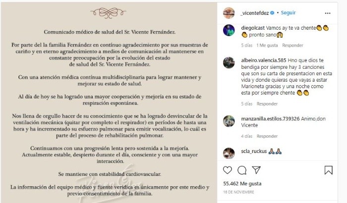 La salud de Vicente Fernández sigue dando de qué hablar, y es que la mañana de este martes medios nacionales reportaron que supuestamente “El Charro de Huentitán” regresó a terapia intensiva hace más de una semana a causa de una neumonía.No obstante, el último reporte de los médicos sobre la salud de Vicente Fernández fue publicado por sus familiares el día 16 de noviembre, donde se afirmaba que “Chente” presentaba una mejoría en su salud.“Al día de hoy (16 de noviembre) se ha logrado una mayor cooperación y mejoría en su estado de respiración espontánea”, se lee en el comunicado compartido por la familia.Incluso Camila Fernández, nieta de Vicente Fernández, dijo a EL INFORMADOR que su abuelo tenía una mejoría, incluso podía mover sus ojos, su cabeza y la mandíbula.Además, médicos explicaron que Vicente se había logrado esvincular de la ventilación mecánica (el respirador) en periodos de hasta una hora. “Ha incrementado su esfuerzo pulmonar para emitir vocalización, lo cuál es parte del proceso de rehabilitación".Ya son más de tres meses los que ha estado hospitalizado Vicente en el Country 2000 en Guadalajara, a causa de una lesión en las cervicales y una enfermedad degenerativa. Desde entonces, familiares, amigos y prensa se han volcado en buenos deseos para que el cantante jalisciense se recupere lo más pronto posible.Antes de las 22:00 horas de la noche de hoy, en la cuenta de Instagram del cantante Vicente Fernández, se publicó un nuevo parte médico donde se confirma que sí regresó a terapia intensiva debido a la inflamación de sus vías respiratorias bajas.“El Sr. Vicente Fernández el fin de semana presentó inflamación de sus vías respiratorias bajas, por lo cual requirió nuevamente continuar con apoyo respiratorio, ajuste de su medicación y se trasladó a terapia intensiva para mantener una mayor vigilancia ante cualquier eventualidad”.AC