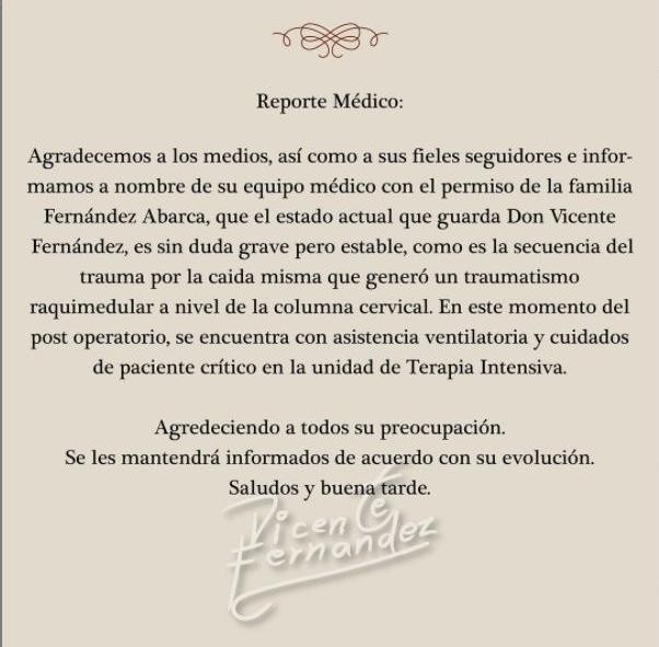 La prensa de espectáculos sigue cubriendo el estado de salud de Vicente Fernández y hace unos momentos su hijo, Vicente Jr. confirmó que su padre está estable, que está semisedado y siguiendo con su tratamiento, según lo difundió el programa “Ventaneando”; además, confirmó Vicente Jr. que a las 18:00 horas se estará publicando el parte médico en redes sociales.“Él está ahorita en su tratamiento y todo estará en el reporte que van a pasar los médicos, él está semi-sedado y respondiendo bien al tratamiento”. Una reportera le cuestionó si “Chente” está intubado, pero Vicente Jr. solo reconfirmó que continúa con su tratamiento.“Los terapeutas dicen que está teniendo una buena respuesta, es lo que sabemos y lo que les podemos compartir nada más, lo demás se los van a compartir los doctores en el parte médico”.Vicente Jr. además, pidió a la prensa que le hagan preguntas con fondo, pues tomó con resquemor cuestionamientos sobre cómo está apoyando a su mamá, o qué le diría a su padre, cuando para él es evidente la importancia que tiene la familia al acudir directamente al hospital para ver cómo avanza todo. “No echen a perder su trabajo haciendo preguntas de ese tipo porque no las voy a contestar, ni mi familia”.Finalizó al decir que su padre está reaccionando y está consciente. “Hasta ahora estamos esperando cómo van resultado las cosas con el tratamiento que traen los doctores”.Si te interesó esta noticia y quieres saber más, entonces descarga y descubre INFORMAPlus, la aplicación digital de EL INFORMADOR, en donde tenemos contenidos exclusivos, seleccionados por nuestros editores, para darles una experiencia más completa a los lectores.Descarga la aplicación y pruébala GRATIS por treinta días.Para iOS: https://apple.co/35jaVgbPara Android: https://bit.ly/3gwVSEVSi eres suscriptor de EL INFORMADOR tu acceso está incluido, solicítalo al 33 3678-7777MB