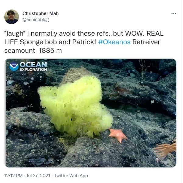 El científico marino Christopher Mah descubrió algo que rápidamente ligó al divertido y reconocido programa de caricatura “Bob Esponja”Mah encontró una esponja marina y una estrella de mar que parecían acompañarse el uno con el otro, y el científico no pudo evitar la referencia a la caricatura.Hizo el descubrimiento en la ladera de una montaña submarina llamada Retriever Seamount, a unas cuantas millas del este de la ciudad de Nueva York.“Normalmente no suelo mirar allí... pero WOW. ¡Bob Esponja y Patricio EN LA VIDA REAL!”, tuiteó Mah, investigador afiliado a la Administración Nacional Oceánica y Atmosférica.La esponja similar a Bob Esponja pertenece al género Hertwigia y la estrella de mar parecida a Patricio se conoce como condraster.Además comentó que el color amarillo brillante de la esponja es realmente sorprendente pues normalmente suelen ser naranjas o blancas según la profundidad bajo el agua, esto para ayudarlas a integrarse con su entorno.