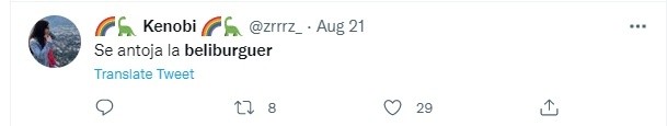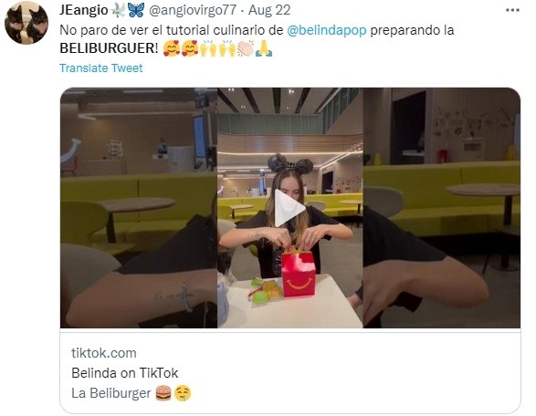 Belinda tiene gran disciplina cuando de ejercitarse se trata, sin embargo, la cantante ha dicho en múltiples ocasiones que tampoco se restringe de comer lo que le gusta. Por ello, se animó a compartir con sus seguidores un tutorial de cómo prepara su hamburguesa favorita, a la que denominó como "la beliburguer".La cantante mostró su gusto por las hamburguesas. En un video de "TikTok", la también actriz explicó cuáles eran los pasos que seguía para preparar su hamburguesa perfecta, la cual título con el nombre de "la beliburguer".En el clip, puede verse acompañada por un grupo de amigas y amigos, entre ellos también está su madre Belinda Schüll, en un famoso restaurante de comida rápida. "Y así es como preparo mi hamburguesa". Luego de abrir la caja donde de la hamburguesa, explica paso a paso de la preparación:"Fuera los pepinillos y ahora viene la mejor parte, partimos los nuggets en pedacitos y los metemos en la hamburguesa, ponemos la mostaza miel, después sweet n´sour y por último la kétchup. Y es así como se prepara una 'beliburguer', remata la cantante luego de darle una gran mordida, acompañada de una carcajada de quienes la acompañan.Internet no se hizo esperar y sus fans plasmaron en redes sociales su deseo de encontrar esta hamburguesa en el menú del restaurante de comida rápida.
