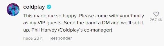 La reacción de un niño tras recibir unos boletos para el concierto de Coldplay se hizo viral en TikTok, tanto que la banda liderada por Chris Martin lo pudo ver y hasta reaccionó con una sorpresa. Se trata de un pequeño que lloró al ver que su regalo de Navidad fueron boletos para los conciertos de Coldplay. Hay que recordar que estos pases estuvieron peleados el día de su venta, el pasado 19 de octubre.“No, no te la creo”, se oye decir al niño al momento de abrir el obsequio. Posteriormente corre a abrazar a sus padres y comienza a llorar.De entre los miles de comentarios del video, destaca el de la banda Coldplay desde su cuenta oficial: “Esto me hace tan feliz. Vengan con su familia como invitados VIP. Envía un mensaje directo a la banda y lo arreglamos”, escribió el mánager del grupo.El video de @mariahez19 consiguió más de 800 mil “me gusta” y superó los 10 mil comentarios. Sin duda un excelente regalo de Navidad, ¿no crees?Coldplay se presentará en México los días 25 (Monterrey) y 29 de marzo (Guadalajara), así como el 3 de abril (CDMX) de 2022.AC