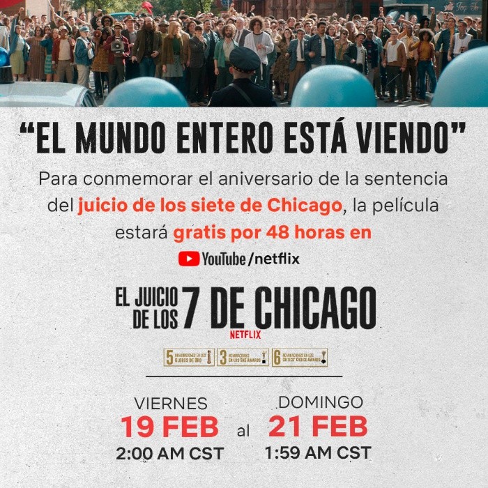 La plataforma de Netflix informó que la transmisión de “El juicio de los siete” a través de su cuenta oficial de YouTube, es una forma de recordar el sometimiento del que fueron víctimas siete jóvenes arrestados, juzgados y condenados, al ser acusados de ser los presuntos líderes de los altercados que se vivieron en Chicago durante la convención del Partido Demócrata.