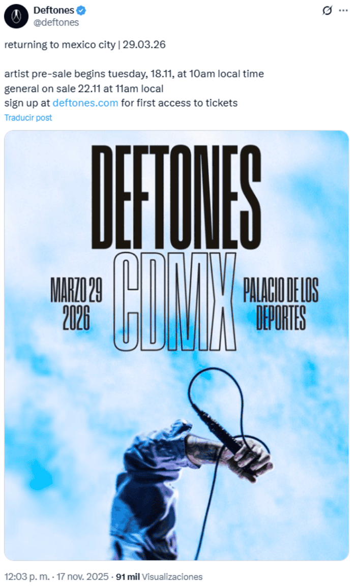 Tras su presentación en el Corona Capital 2025, Deftones regresará a la Ciudad de México para ofrecer un único concierto en el Palacio de los Deportes el próximo 29 de marzo de 2026.Los boletos estarán disponibles a través de Ticketmaster y en las taquillas del recinto, con la siguiente programación de venta:Precios de boletosDeftones, originarios de Sacramento, California, se han consolidado como una de las bandas más influyentes del rock alternativo y metal contemporáneo. La banda liderada por Chino Moreno ha desarrollado un estilo único que combina guitarras pesadas, atmósferas experimentales y voces intensamente emocionales.Se espera que su concierto en el Palacio de los Deportes incluya un setlist con más de tres décadas de éxitos, desde clásicos como Change (In the House of Flies) hasta canciones de Ohms y White Pony. Los fans vivirán una noche cargada de intensidad y la distintiva atmósfera sonora que caracteriza a Deftones.SV