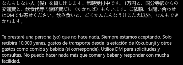 Estudió física en una Universidad en Osaka, Japón, pero al darse cuenta que eso no lo hacía feliz, este hombre cambió de carrera y ahora gana dinero por "no hacer nada".Shoji Morimoto descubrió que podía iniciar un negocio en el que, literalmente, se "renta" a extraños que, de antemano, saben que no sabe hacer nada excepto comer, caminar y beber.Todo inició con una publicación en su cuenta de Twitter (@morimotoshoji) en donde compartió: "me rento como una persona que no hace nada. ¿Te es complicado entrar a una tienda a ti solo? ¿Extrañas a un jugador de tu equipo? ¿Necesitas a alguien que se forme en una línea por ti? No sé hacer nada que no sea sencillo".Aunque en ese momento ofrecía sus servicios de manera gratuita, debido al éxito ha comenzado un negocio por el que cobra 10 mil yenes (aproximadamente mil 900 pesos). Además de esa tarifa sus clientes deben cubrir sus gastos de transporte y otros gastos como la comida o bebida, en caso de que ese sea el servicio que prestará.Todo eso está especificado en su biografía de Twitter.Dos años después de haber iniciado con este proyecto, Morimoto tiene un libro en donde narra algunas de las cosas que ha vivido con sus clientes.De acuerdo a varios medios internacionales, Shoji atiende cerca de cuatro clientes por día y un total de tres mil desde que comenzó a "rentarse".AC