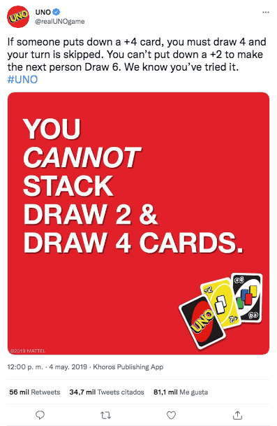 UNO, el divertido juego de cartas que ha provocado rivalidades en millones de familias y amistades alrededor del mundo, cumple 50 años este 2021 con algunas curiosidades en su historia dignas de compartir en tu próxima partida. Fue Merle Robbins, quien creo la primera versión de este juego de cartas, que pudo disfrutar con su familia y amigos durante algunos meses, antes de decidir comenzar a venderlo (motivado por todos ellos) poniendo todo su esfuerzo y recursos para lograr una primera edición a mayor escala que contemplaba 5,000 copias impresas. Solo un año después, Merle vendió los derechos de su exitoso juego al dueño de una funeraria llamado Bob Tezak y sus socios, en un trato que fijaba un pago único por 50,000 dólares y una regalía de 10 centavos por cada mazo vendido. Aunque el póker sea reconocido como el juego de cartas más famoso del mundo, el juego del UNO no se le queda atrás, pues durante los últimos 50 años ha entretenido a millones de familias de varias generaciones. Ya sea causando rivalidades impredecibles con los +4 o dando agradables sorpresas con 'algún comodín', este clásico se ha convertido en uno de los juegos más buscados cada navidad desde que se vendieran sus primeros mazos de cartas en 1971.Los cantantes Joe Jonas y Ashley Simpson participaron este año en varias actividades realacionadas al 50 aniversario del UNO, como el Championship Series Vegas.Se venden 10 millones de barajas al añoMattel ha sido la compañía que más se ha beneficiado del UNO, que entre todas sus versiones, venden aproximadamente 17 copias por minuto, superando cada año con facilidad los récords anteriores y acumulando un total de 150 millones de copias comercializadas desde que compraran los derechos del divertido juego de mesa a inicios de los noventa, esta vez por la cantidad de 2 millones de dólares.Este 2021, con motivo del 50 aniversario de haberse creado la primera baraja de UNO, Mattel organizo el primer UNO Championship Series en Las Vegas, en el que el mexicano Aldwin Rodríguez (de 20 años) fue reconocido como ganador de la competencia, volviendo a casa con un enorme trofeo y un premio de 50 mil dólares, equivalente a poco más de un millón de pesos.En un juego común, la mayoría de nosotros se ha salvado del clásico +4 colocando sobre la mesa un +2 o incluso otro +4, acumulando la cantidad para el siguiente que compañero, que en ese momento verá hundidas todas sus esperanzas de ganar la partida. Bueno, por sí no lo sabías, ya no podrás fingir inocencia cuando suceda, pues en 2019, la cuenta de UNO en Twitter lanzó esta importante aclaración:“Si alguien pone una carta +4, debe robar 4 y se salta su turno. No puedes poner un +2 para que la siguiente persona empate 6. Sabemos que lo has probado”.Cada mes se lanzan distintas ediciones especiales que surgen de colaboraciones con artistas, o están basadas en personajes populares del cine, la televisión y la cultura pop que, sumadas a las colaboraciones y lanzamientos de años anteriores, forman una muy amplia colección de estas cartas conocidas en casi todo el mundo.En 2019, Mattel anunció una versión del juego para invidentes, con los números y colores de las cartas grabados en braille, con lo que da la posibilidad de jugar a millones de personas invidentes en Estados Unidos y el resto del mundo.