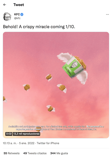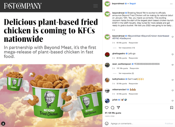 Luego de haber realizado varias pruebas en más de 70 establecimientos a lo largo de los últimos dos años, finalmente KFC ha confirmado que incluirá una nueva receta de pollo frito hecho a base de plantas en el menú de las 4,000 sucursales de la cadena en Estados Unidos a partir del próximo 10 de enero.El tipo de proteina fue desarrollada en conjunto con Beyond Meat, una empresa enfocada en la producción de sustitutos de carne, que en este caso diseño una receta exclusiva para el restaurante fundado por el Coronel Sanders. De acuerdo a la compañía, el pollo fue pensado para que se triture en la boca igual que un trozo de tejido muscular, dejando la sensación característica del alimento, lo cual mencionan, ha sido más difícil y costoso de llevar a cabo que producir el típico pollo vegetal sencillamente molido y compacto.Los pequeños trozos con forma similar a la de un nugget del Beyond Fried Chicken se venderán en paquetes de 6 y 12 piezas con un costo de 6,99 dólares para el primero, aunque de momento, estarán disponibles únicamente en Estados Unidos por un periodo de tiempo limitado. “La misión desde el primer día fue simple: hacer el Kentucky Fried Chicken de fama mundial a partir de plantas”, mencionó el presidente de KFC. Kevin Hochman. “Y ahora, más de dos años después, podemos decir 'misión cumplida'”.Fundada en el 2009, Beyond meat es una empresa norteamericana con sede en Los Ángeles enfocada en la producción de sustitutos de carne animal. Recientemente, la compañía ha aumentado su participación dentro de Yum! Brands, la matriz de la cadena de restaurantes KFC, con la que trabaja para desarrollar e incorporar nuevas proteínas vegetales a otras de sus cadenas como Pizza Hut y Taco Bell.Cabe mencionar que este nuevo producto no está dirigido a los consumidores veganos y vegetarianos, ya que el Beyond Fried Chicken se elabora con el mismo equipo con el que preparan el pollo frito tradicional.CP