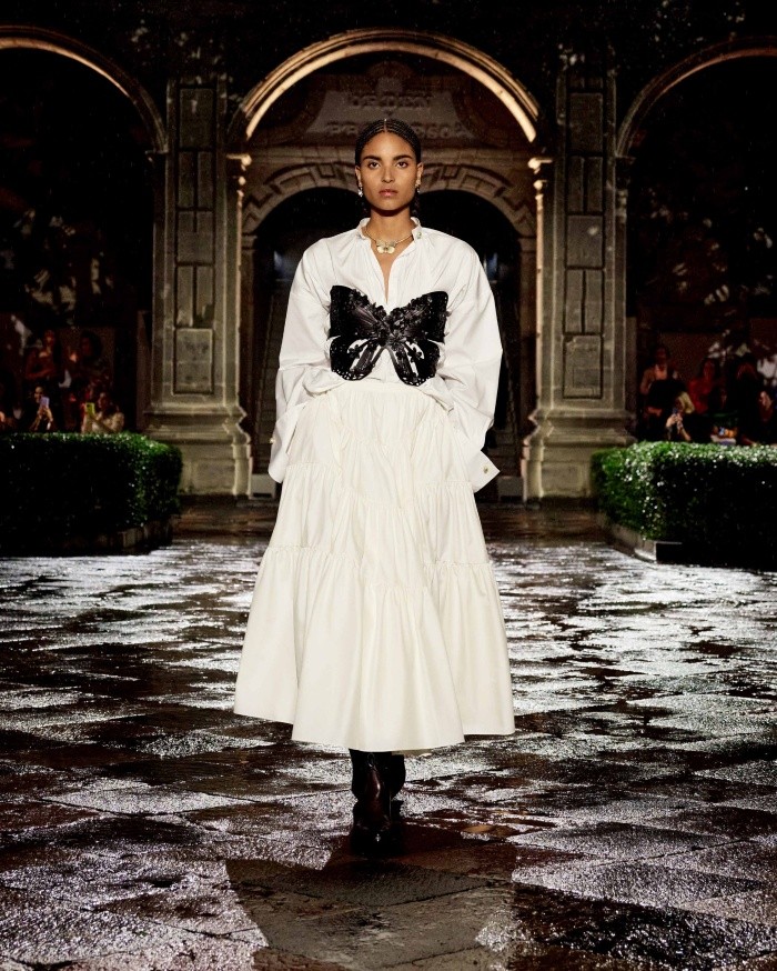 Definitivamente Dior es uno de los referentes mundiales de la moda en el mundo y el haber considerado a nuestro país para presentar su colección Cruise 2024 es un gran acontecimiento que pone a México en los ojos de la industria de la moda Internacional.Mientras escribía esta columna decidí escuchar la serie de canciones que estuvieron en el desfile , todas ellas hacíendo referencias claras al amor y que construían en cada una de sus estrofas momentos extremadamente emocionales, fieles a la esencia más clara de todos los mexicanos.Con Maria Grazia Chiuri al frente de la dirección creativa de Dior, esa noche fue mágica para propios y extraños, no sólo por la maestría en la confección que la directora creativa pone en cada una de sus creaciones, sino por los simbolismos que transmitió a lo largo de los 17 minutos que duró el desfile.Para nadie es desconocido la fascinación de la directora creativa por los bordados y el trabajo textil alrededor del mundo, ahí es donde hace todo el sentido que la colección Cruise de este año haya hecho su aparición en México.Con un trabajo de más de un año con productores locales y bordadores, la directora creativa de Dior nos mostró esa noche su ya tradicional estilo tomando como inspiración principal a Frida Kahlo, la mariposa y los textiles mexicanos.El show tuvo lugar en el Antiguo Colegio de San Ildefonso, este increíble recinto en cuyas paredes se cuenta la historia de México a través de los impactantes murales de Diego Rivera, David Alfaro Siqueiros y José Clemente Orozco; lugar perfecto para albergar a la prensa internacional, invitados especiales y clientes de la Maison en todo el mundo.“Una constelación de lugares que despiertan emociones: esto es lo que México es para Maria Grazia Chiuri. Un lugar del alma, como lo fue para los artistas surrealistas. La figura emblemática de Frida Kahlo continúa ofreciendo una poderosa conexión con esta cultura, celebrada en el corazón de la colección crucero 2024 de Dior” nos contó la marca en su boletín de prensa.La colección Cruise 2024 comenzó con una serie de vestidos y looks en color negro, con volantes, hombros exagerados y mariposas en los accesorios y en los estampados, que hacen alusión a la belleza cautivadora de la fragilidad y se ven realzadas por la variedad de encajes de algodón, cáñamo y seda seleccionados, que subliman el jersey y el terciopelo negro, y por los jacquards irresistiblemente preciosos.Para esta nueva línea, Maria Grazia Chiuri ha vuelto a establecer fuertes lazos con los artesanos locales como es su costumbre alrededor del mundo en donde los bordados originales, co-creaciones elaboradas con sus talleres, adornan notablemente vestidos y camisas. Para la casa y en la visión de la directora creativa “La historia de la feminidad se construye a partir de una relación con el entorno natural, en un equilibrio de compromiso y desenfado”De llamar la atención el casting lleno de talento mexicano, modelos internacionales como la Jalicienses Karime Bribiesca y Tindi Mar, entre muchas otras, desfilaban al compás de la increíble música mexicana llenándonos de orgullo al mismo tiempo de transmitir con enorme maestría la visión creativa de Chiuri.La lluvia fue el invitado espontáneo de la noche, lo que le agregaba un toque de dramatismo y espectacularidad a la colección, que cerró al ritmo de “Canción Sin Miedo” de Vivir Quintanar y Mon Laferte, en protesta por la violencia hacia las mujeres de nuestro país con una serie de vestidos blancos con frases bordadas en memoria de las víctimas de feminicidio en México.Y es que no nos debe llamar la atención que Dior haga este tipo de expresiones en pro del feminismo en el mundo, Maria Grazia Chiuri es la primera mujer al frente de esta casa de lujo y es, por tanto, portadora de una fuerte esencia feminista en donde la mujer, su esencia, empoderamiento y dignificación se hace presente en todas sus creaciones.La moda es arte, estoy muy de acuerdo, y como tal forma parte de la expresión humana y nuestra historia, por lo que cerrar esta pasarela con una protesta de este tamaño me pareció un gesto por demás conmovedor.Seguramente habrá mucho que observar en la historia que construirán juntos Dior y México, pero creo que el balance en general es muy positivo, definitivamente pone a nuestro país en la mente y en los ojos del mundo, recordándonos y recordándoles de que estamos hechos; sin lugar a duda coloca a la artesanía mexicana como el trabajo de lujo que es y dignifica el trabajo que nuestros artesanos le ponen a la construcción de sus creaciones.Ojalá este tipo de acontecimientos sigan sucediendo en nuestro país con más frecuencia cada uno de ellos, sin duda, nos traen un sinnúmero de cosas positivas y construyen nuestra reputación dentro y fuera de México. Viva la moda, Viva México, Viva Maria Grazia, Viva Dior…CP