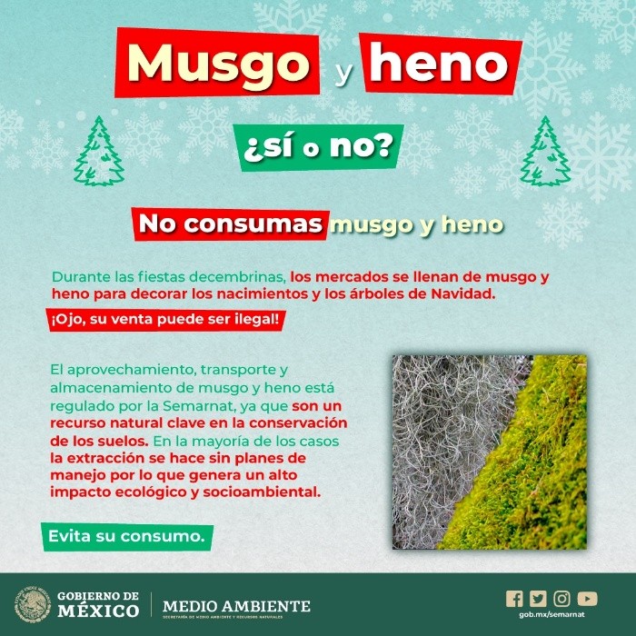 No se trata de dejar a un lado las tradiciones navideñas, sino de modificar los hábitos en la decoración para evitar provocar impactos ambientales negativos.La Secretaría de Medio Ambiente y Recursos Naturales (Semarnat) explica que tanto el heno como el musgo son recursos forestales no maderables, que se recolectan directamente del bosque por lo que no pueden ser cultivados; además de que este último tarda años en crecer.Al comprarlos facilitas su extracción ilegal, el deterioro de los bosques, la erosión de los suelos, la reducción de la biodiversidad y puede empeorar la crisis hídrica.La comercialización del musgo, como el heno, comúnmente utilizada para las decoraciones, es ilegal en México, así lo marca la Ley General de Equilibrio Ecológico y Protección del Medio Ambiente.Está prohibida la extracción de cualquier especie o material de los bosques que no cuenten con un permiso y un programa de manejo.De acuerdo con la Semarnat, los musgos son plantas pequeñas que carecen de tejido vascular o leñoso; viven en ambientes muy variados, desde las altas montañas hasta el nivel del mar, en las selvas húmedas o en zonas áridas.Son el segundo grupo más importante dentro de las plantas verdes y unos de los primeros organismos vegetales que ocuparon el ambiente terrestre. A nivel mundial se reconocen alrededor de 12,800 especies. En México se reconocen 980 especies de musgos, de las cuales 106 especies son endémicas a nuestro país, esto es 10.8%.Mientra que el heno es una hierba grisácea que crece sobre las ramas de los árboles con tallos colgantes en forma de hebra muy delgadas (menos de 1 mm de grosor) ramificados y con entrenudos de hasta 8 metros de largo, usualmente sin raíces.En época de lluvias capta la humedad del ambiente y forma enormes cortinas colgantes en los árboles aumentando la humedad relativa de los bosques.Adquiere un árbol navideño con los productores nacionales en las plantaciones de diversas variedades de pino que existen en la Ciudad de México, Estado de México, Puebla, Guanajuato, Jalisco y Michoacán, entre otros estados.Elabora un árbol navideño con materiales desechables como PET, cartón, revistas viejas, madera, tela y muchos otros más. *Mantente al día con las noticias, únete a nuestro canal de WhatsApp aquí: https://whatsapp.com/channel/0029VaAf9Pu9hXF1EJ561i03MV
